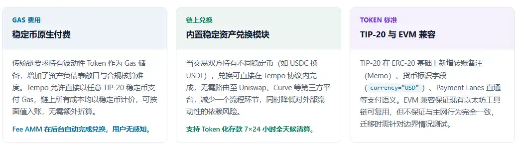 Tempo traite les stablecoins comme des citoyens de première classe du protocole, en repensant toute la chaîne, des frais de Gaz à l'échange on-chain en passant par le standard de Token, autour des stablecoins.