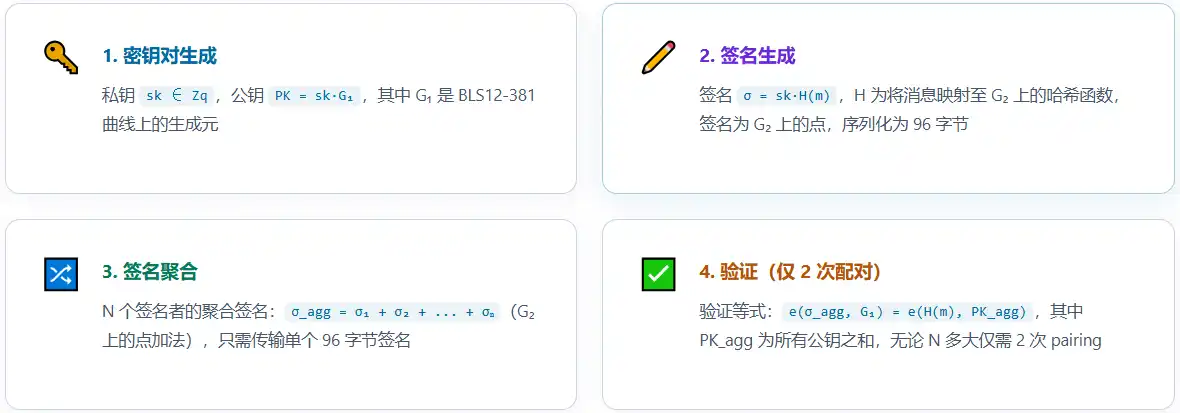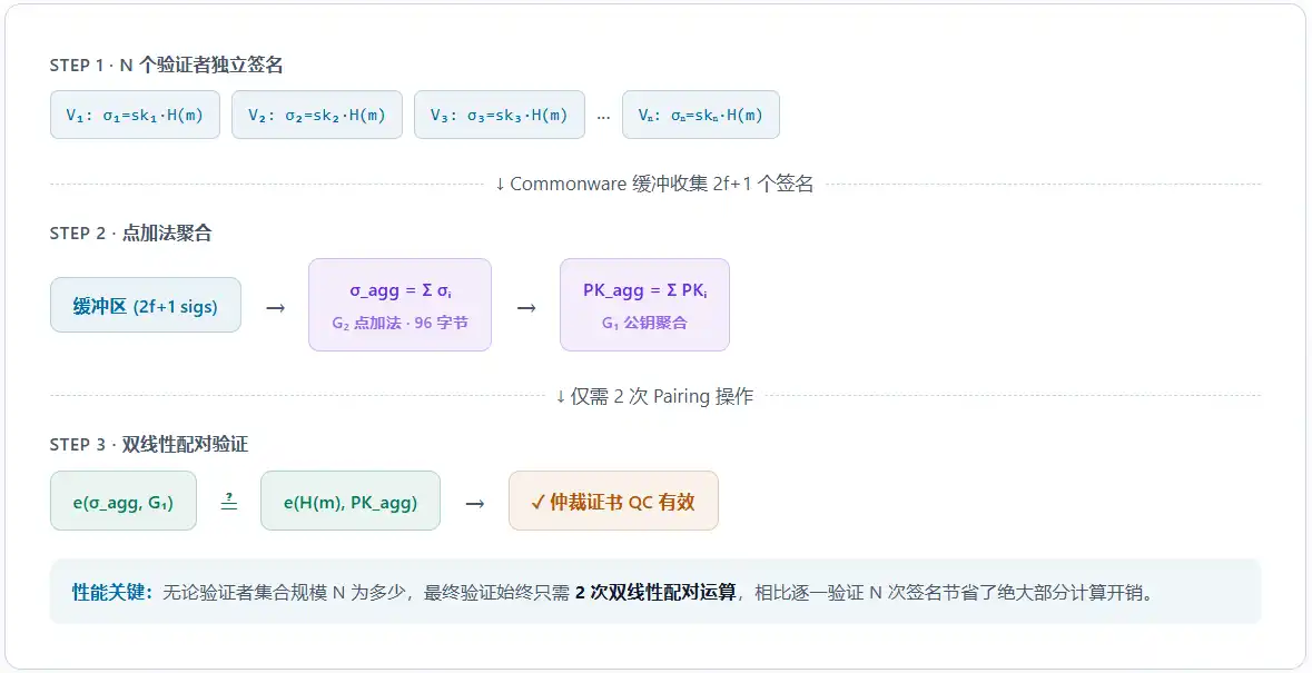 L'utilisation du schéma BLS (Boneh-Lynn-Shacham) permet d'agréger les signatures de N validateurs en une seule signature, ne requérant que deux opérations d'appariement de courbes elliptiques pour la vérification, réduisant ainsi significativement la consommation de bande passante et de calcul. Ceci est particulièrement important pour les scénarios de micro-paiements à haute fréquence, permettant de réduire efficacement le coût de calcul et de bande passante par transaction.