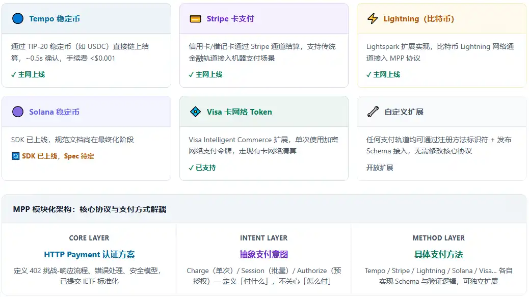 La conception centrale du MPP est de découpler complètement le protocole des rails de paiement. La couche cœur définit uniquement le processus de défi-réponse HTTP, la gestion des erreurs et le modèle de sécurité, sans être liée à un réseau de paiement concret. Ainsi, l'ajout d'un nouveau mode de paiement ne nécessite que l'enregistrement d'un identifiant de méthode et la publication du schéma et de la logique de validation correspondants, sans modifier le protocole lui-même. Lors du paiement, l'agent n'a pas besoin de se soucier du rail sous-jacent ; le serveur déclare les modes acceptables dans la réponse 402, et le client les adapte ensuite selon les besoins. C'est précisément ce qui distingue le MPP des solutions à chaîne unique ou à réseau unique.