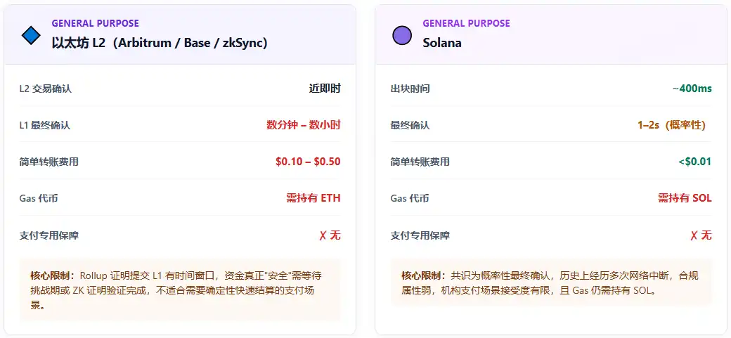 Les L2 Ethereum et Solana sont deux types de chaînes générales actuellement largement utilisées dans les scénarios de paiement. Leurs écarts fondamentaux avec les chaînes dédiées aux paiements se manifestent dans les dimensions suivantes :