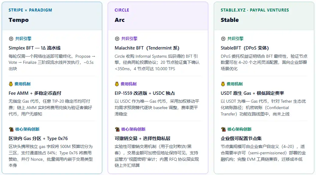 Les trois chaînes sont des L1 dédiées aux paiements, mais leurs approches techniques sous-jacentes diffèrent significativement. Leurs choix technologiques respectifs sont analysés selon trois dimensions : le moteur de consensus, le mécanisme de frais et les innovations architecturales clés.