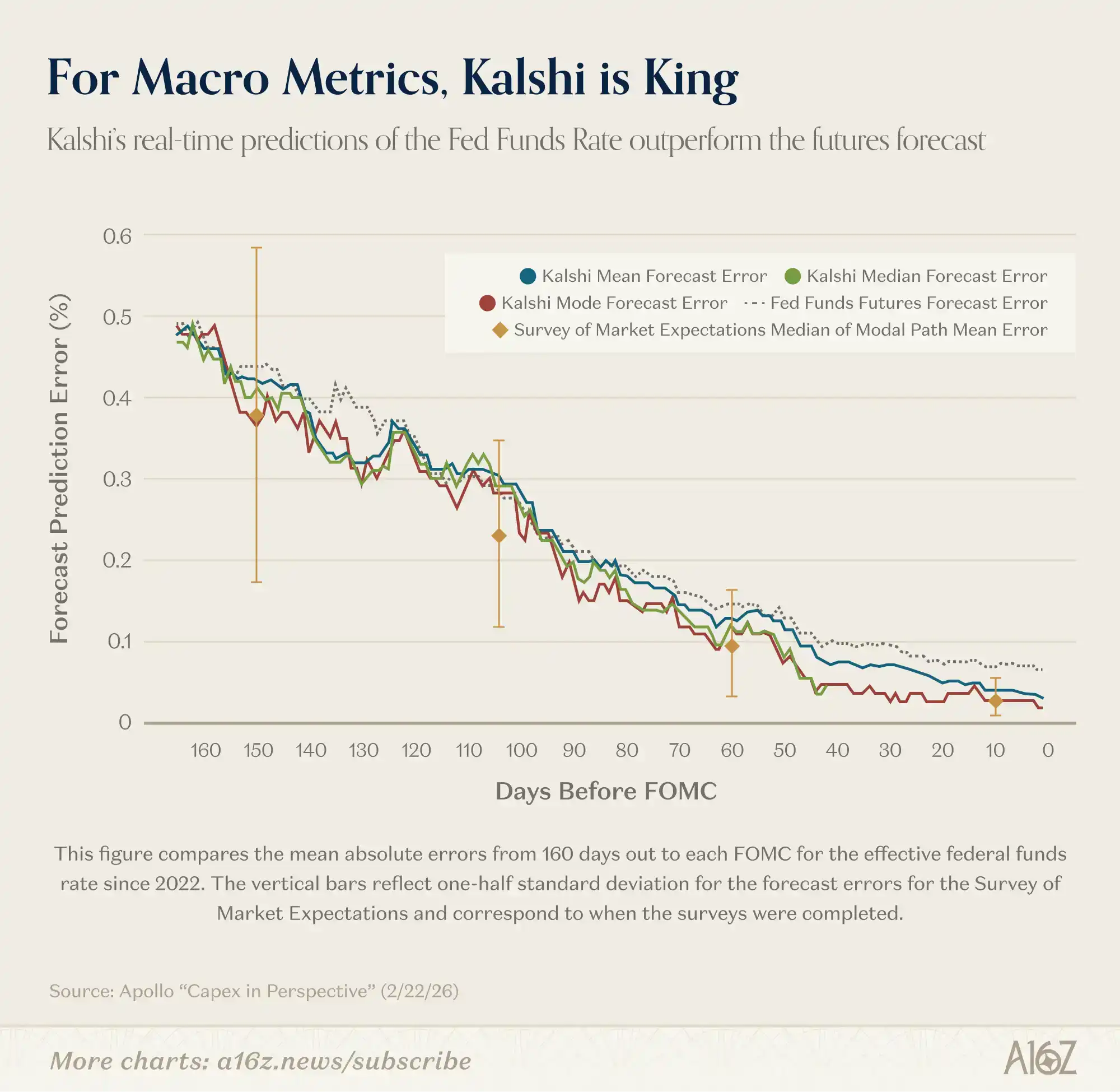 Pour la prévision du taux des fonds fédéraux dans 150 jours (soit après 3 réunions du FOMC), l'erreur absolue moyenne de Kalshi est très proche de celle des prévisionnaires professionnels. Mais contrairement à l'enquête qui ne fournit qu'un instantané de la trajectoire modale toutes les six semaines, Kalshi fournit une distribution de probabilité complète et mise à jour en continu...... Nous constatons que la prévision médiane et modale de Kalshi la veille des réunions du FOMC a un bilan de prédiction parfait, ce qui constitue une amélioration statistiquement significative par rapport aux prévisions des contrats à terme sur les fonds fédéraux.