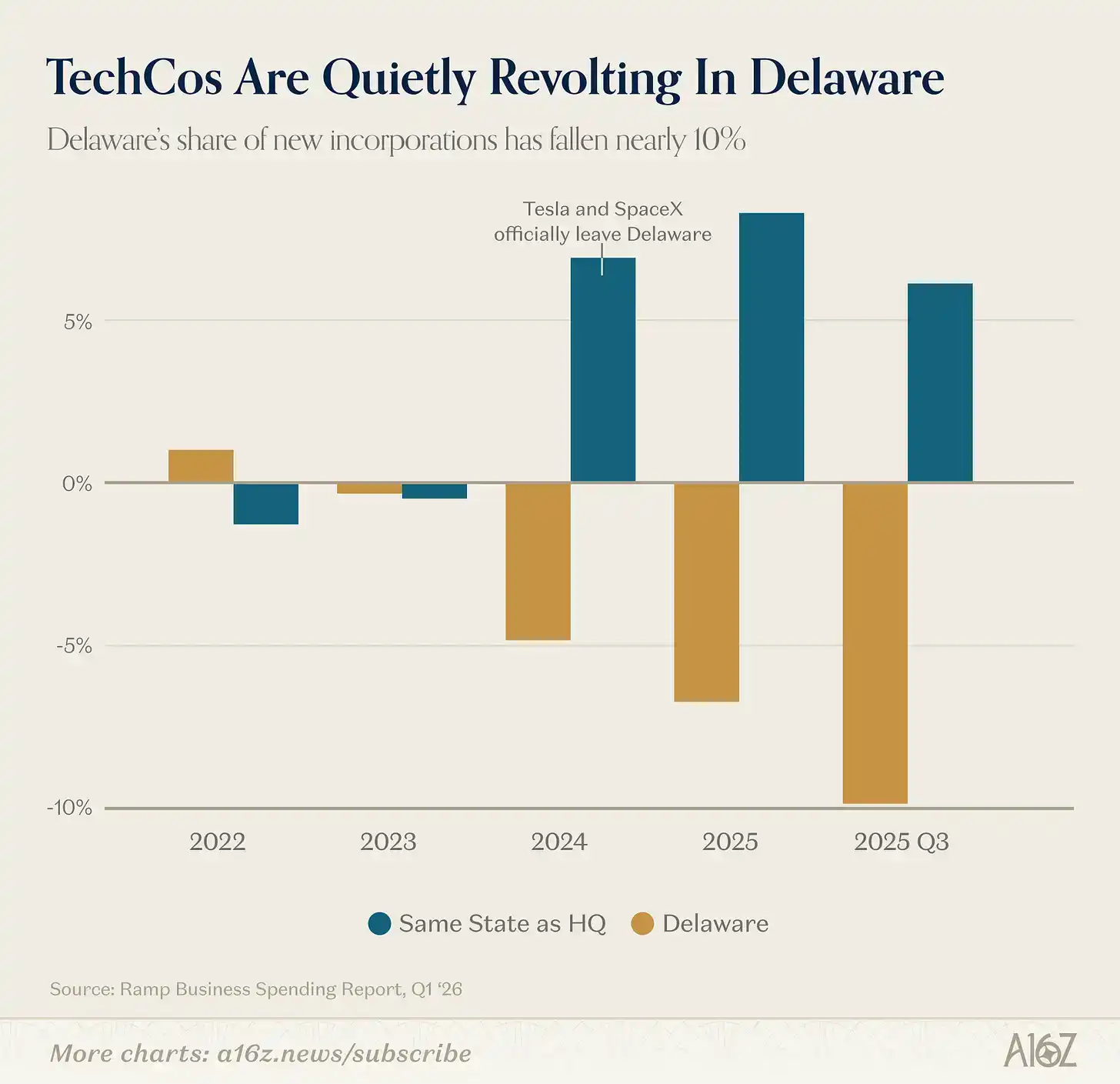 Selon les données de Ramp, la part du Delaware dans les nouvelles immatriculations d'entreprises diminue continuellement depuis 2023, avec une baisse d'environ 10 % au troisième trimestre 2025.
