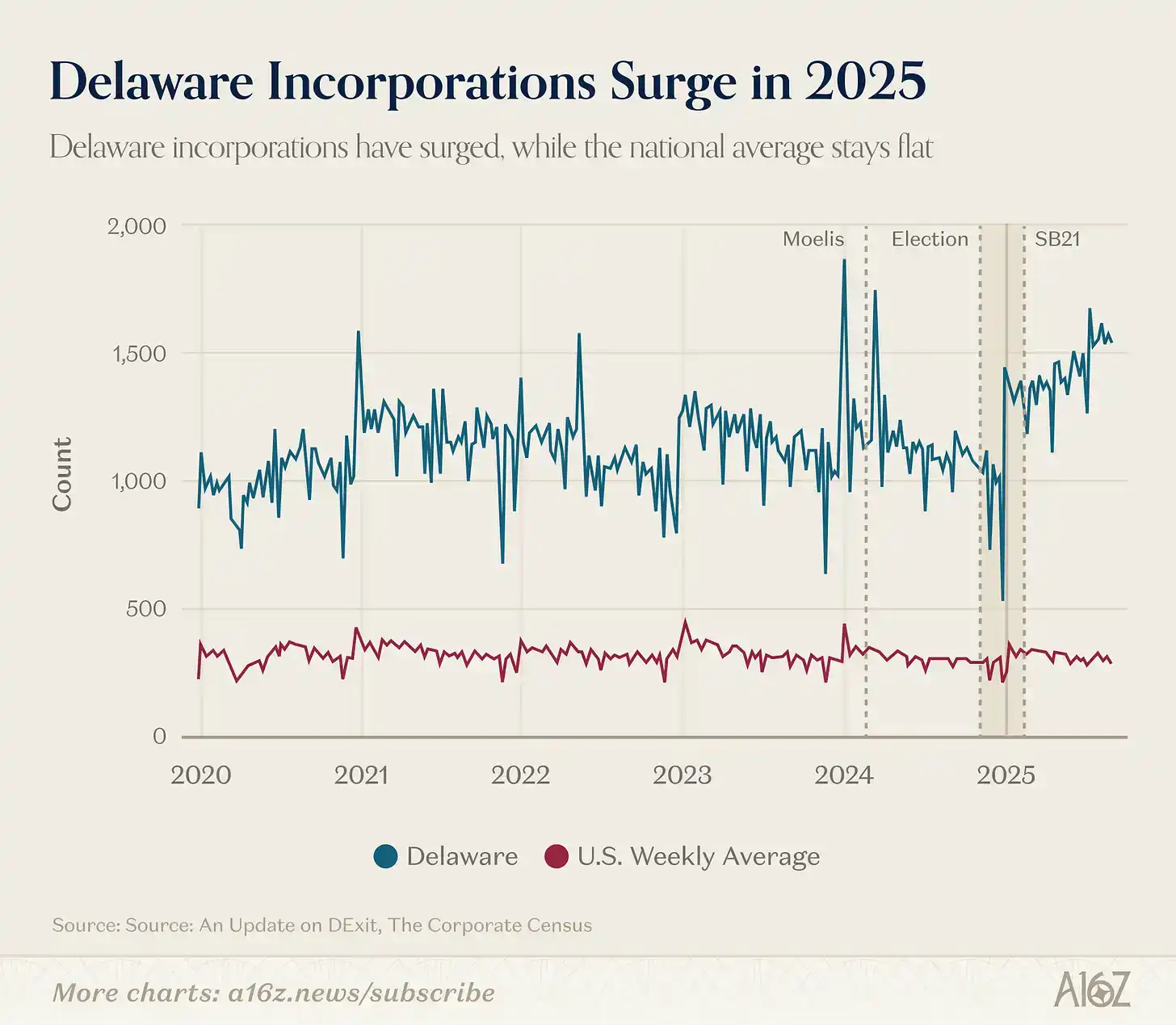Selon les données publiées par le Forum sur la gouvernance d'entreprise de la Harvard Law School, la part du Delaware dans le nombre total d'entreprises aux États-Unis a en réalité considérablement augmenté de fin 2024 à 2025.