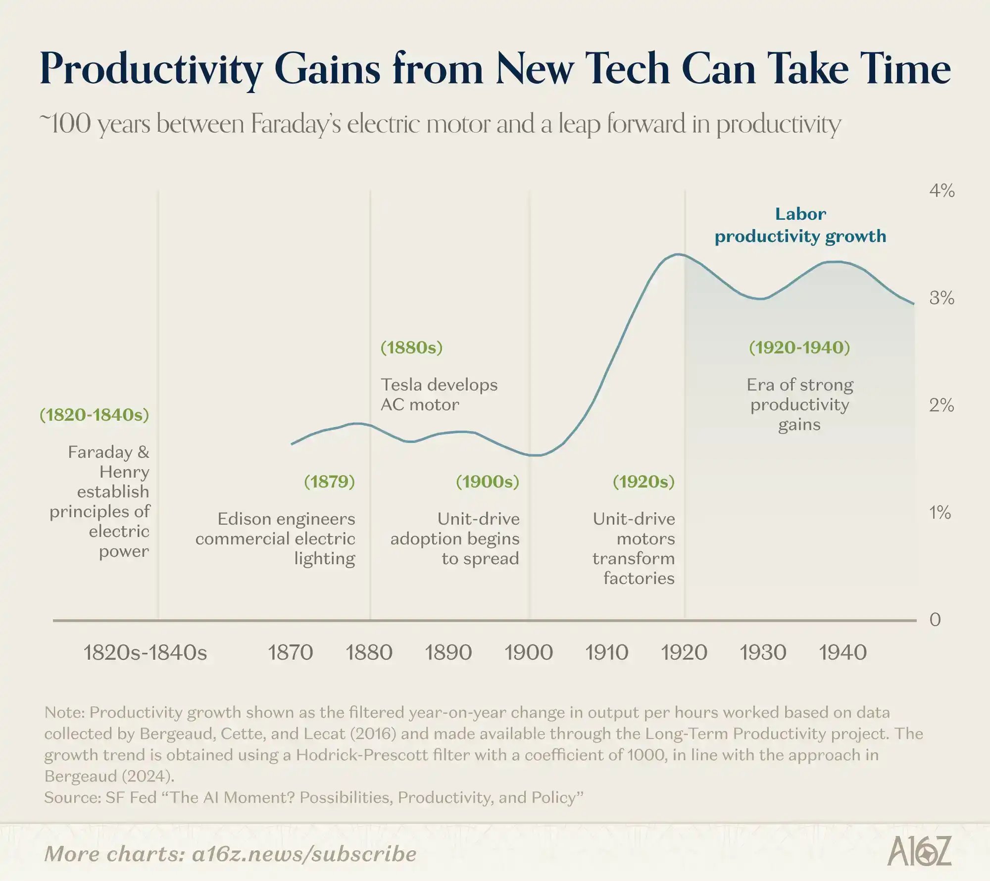 Il a fallu environ 100 ans entre les premières discussions de Faraday et Henry sur le courant électrique et l'émergence réelle de la vague de productivité industrielle dans la première moitié du XXe siècle.