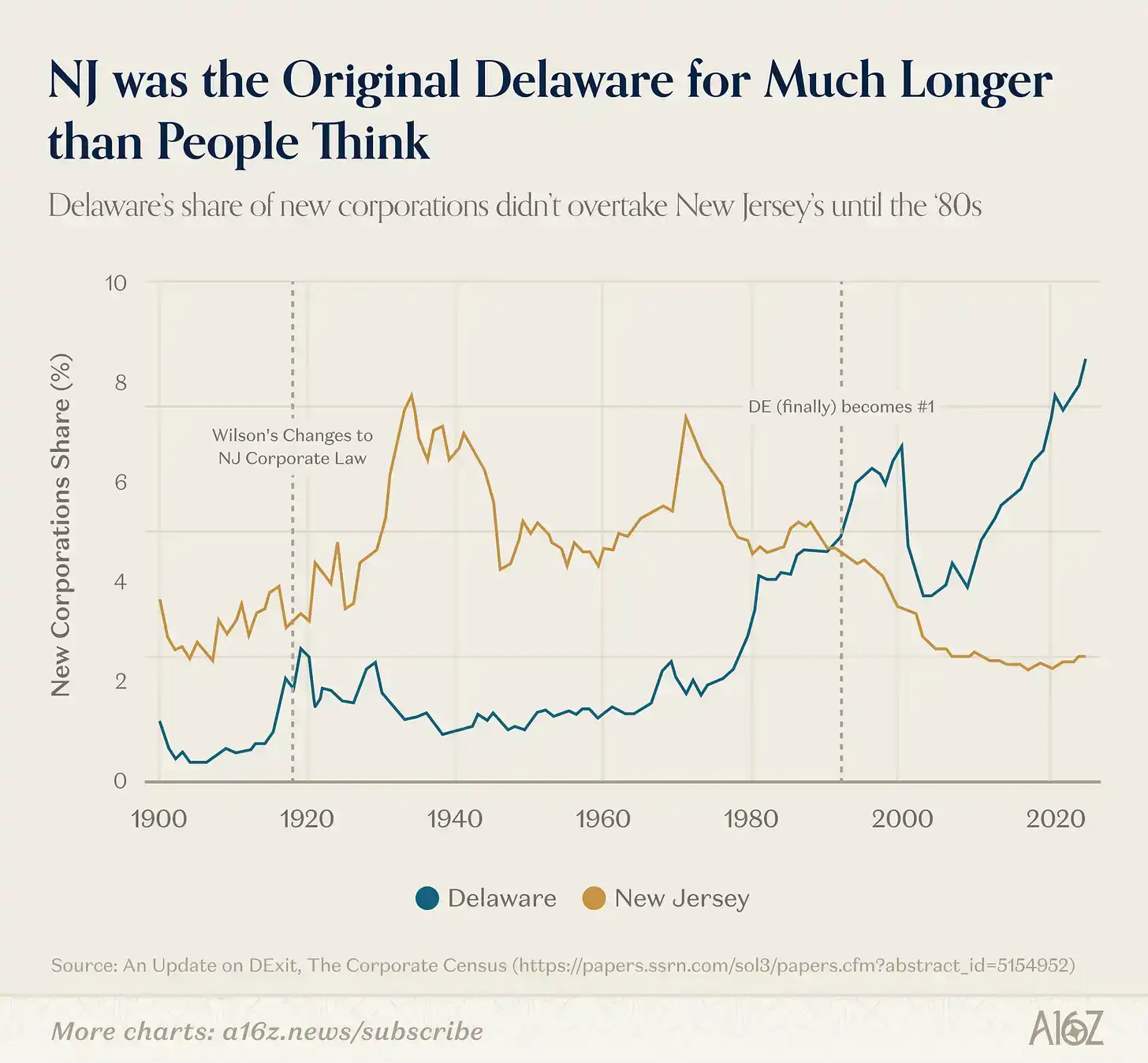 Il y a environ un siècle, le Delaware a remplacé le New Jersey – l'ancienne « mère des trusts » – comme lieu de prédilection pour l'immatriculation des entreprises. Le New Jersey a perdu sa position parce que le gouverneur de l'époque, Woodrow Wilson, a tenté de freiner les « abus des entreprises », ce qui a considérablement détérioré l'environnement des affaires dans le New Jersey. La loi sur les sociétés du Delaware était calquée sur celle du New Jersey d'avant l'ère Wilson, et l'État a donc naturellement accueilli favorablement les entreprises qui partaient, puis, avec la Cour d'équité du Delaware, a passé près de 100 ans à bâtir sa réputation de forum mature et impartial pour résoudre les litiges entre entreprises et investisseurs.