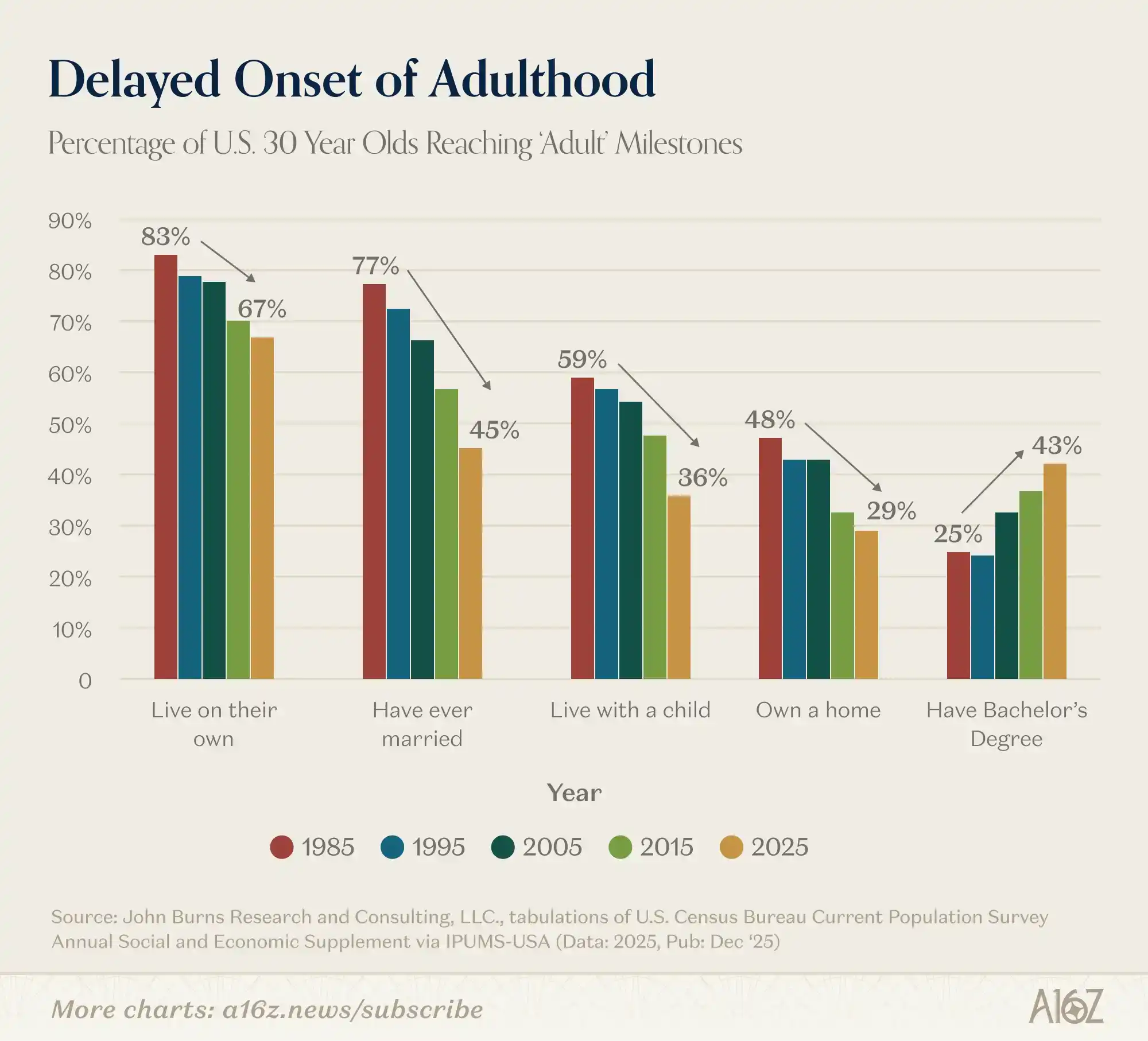 La proportion de personnes de 30 ans atteignant les principales étapes de la vie n'a cessé de diminuer assez fortement depuis au moins les années 1980.