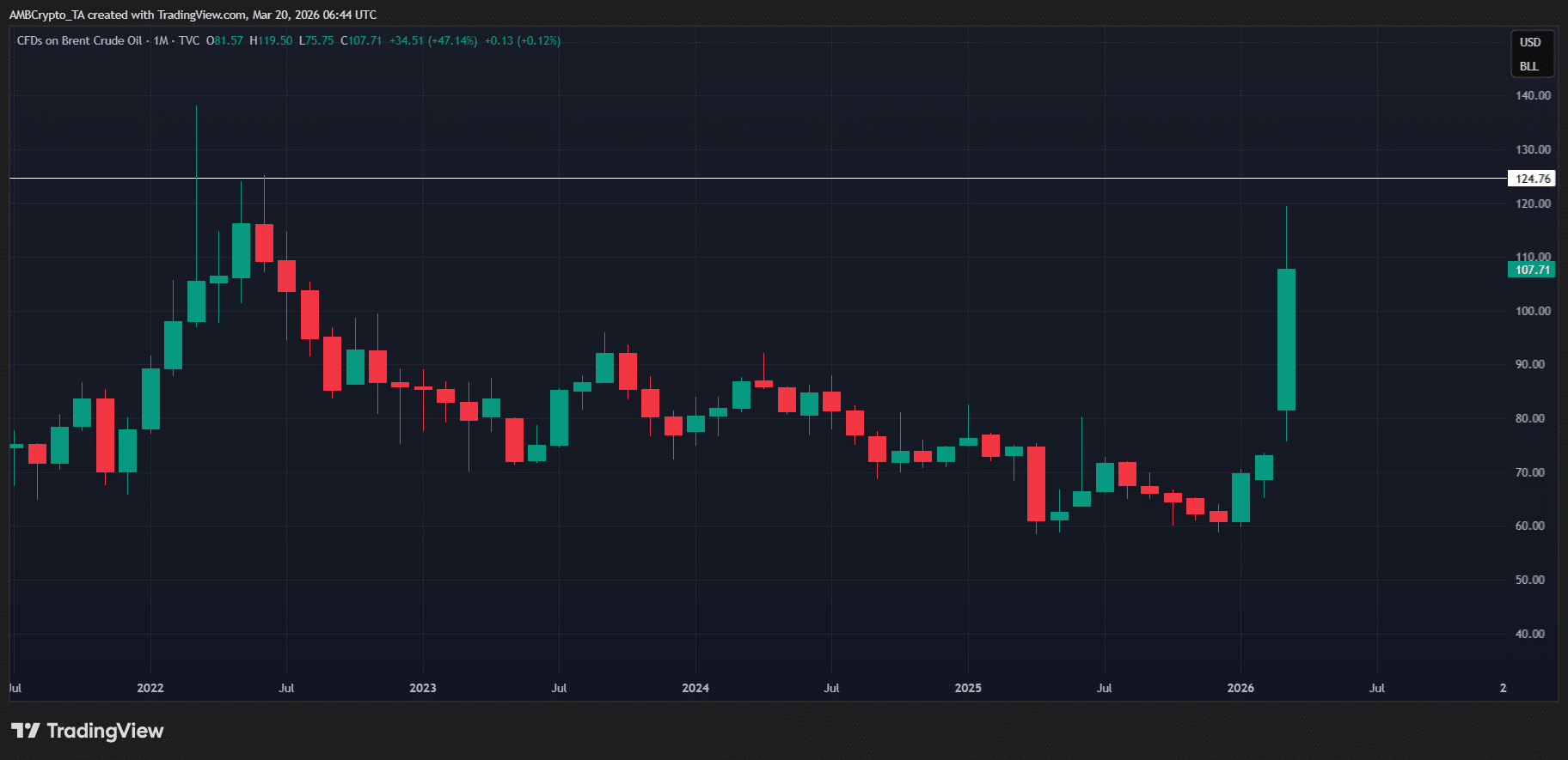 - Le pétrole Brent progresse de 47% en mars tandis que le crypto stagne, montrant que les mouvements risk-on plus larges pourraient dépendre d'un éventuel débouclage sur Hyperliquid.