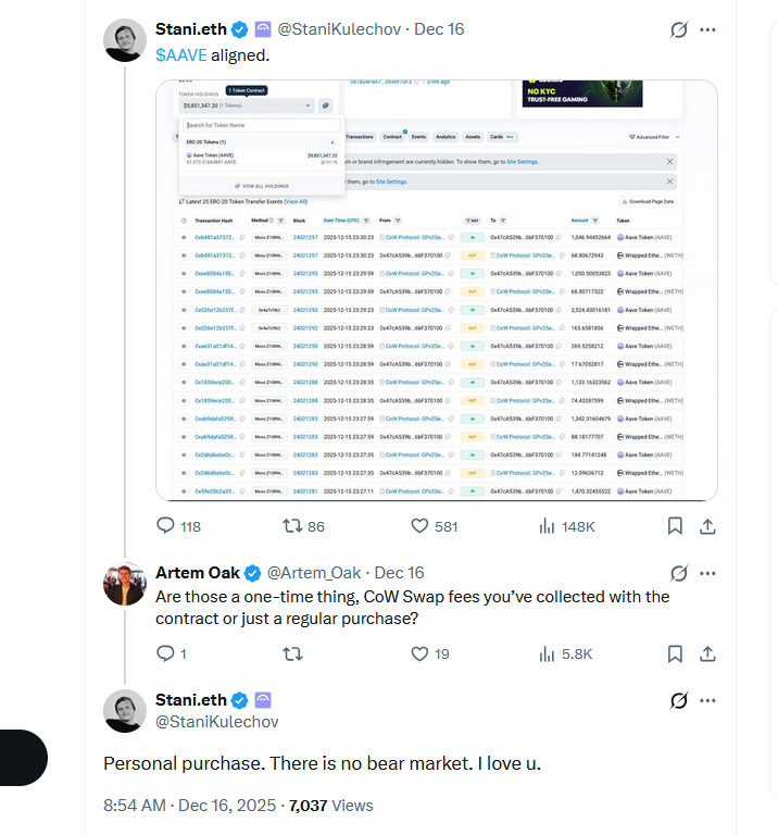 Outre les annonces concernant la SEC et le plan directeur, Kulechov a conclu mardi en partageant qu'il avait personnellement acheté pour 9,8 millions de dollars d'AAVE, en dehors du programme de rachat proposé par l'Aave DAO.