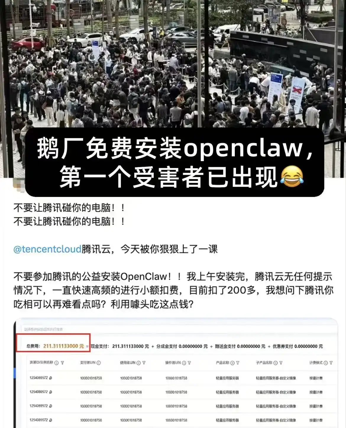 Mais parmi la majorité des participants que nous avons contactés, un grand nombre d'utilisateurs en sont encore au stade de l'installation, ne sachant pas vraiment comment jouer avec, et, de plus, la plupart des gens utilisent OpenClaw avec les versions d'installation simplifiées fournies par diverses sociétés ou plateformes de modèles d'IA. Pire encore, après avoir fait la queue pour se faire installer OpenClaw par l'équipe Tencent Cloud, certains, peu familiers avec le fonctionnement, l'ont laissé fonctionner automatiquement, générant finalement des frais de consommation de Token non négligeables, pour finalement critiquer vertement Tencent Cloud pour son avidité.