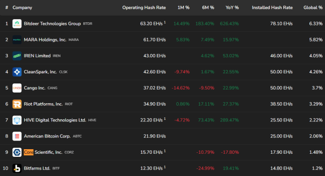 Comparaison des entreprises de minage de BTC en termes de hashrate opérationnel | Source : BitcoinMiningStock
