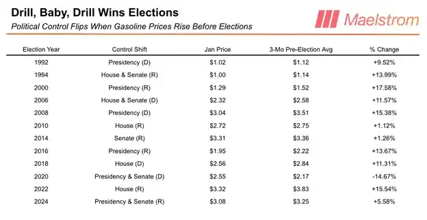 Si cette stratégie est correcte, les marchés du pétrole brut West Texas Intermediate (WTI) et du Brent donneront la réponse. Alors que le PIB nominal et l'offre de crédit en dollars augmentent, le prix du pétrole va-t-il monter ou baisser ? Si le PIB et le prix du pétrole montent ensemble, les Démocrates bleus l'emporteront ; si le PIB monte et que le prix du pétrole stagne ou baisse, les Républicains rouges l'emporteront.