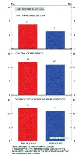 - Landscape politique : Les camps rouge et bleu sont à égalité, seule une petite partie des Américains décide quel camp contrôle le gouvernement.