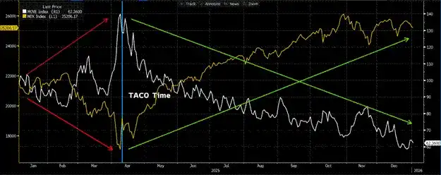 Par exemple, le « Jour de la Libération » du 2 avril dernier et le « TACO » (Action Tarifaire) de Trump le 9 avril suivant en sont un exemple. Trump avait alors menacé d'imposer des tarifs douaniers extrêmement élevés, ce qui aurait réduit les déséquilibres du commerce et des flux financiers mondiaux, produisant un fort effet déflationniste. Le marché s'est effondré en réponse, l'indice MOVE grimpant jusqu'à 172 en cours de séance. Le lendemain, Trump a « suspendu » les tarifs, et le marché a touché le fond avant de rebondir violemment.