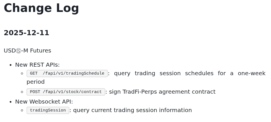 Le journal des modifications de Binance note que le 11 décembre, l'échange a introduit trois nouveaux points de terminaison API, dont un — avec une URL incluant stock/contract — permet aux utilisateurs de « signer [un] contrat d'accord TradFi-Perps ». Les deux autres points de terminaison introduits le même jour permettent aux utilisateurs d'interroger « les horaires des sessions de trading pour une période d'une semaine » ou « les informations actuelles sur la session de trading ».