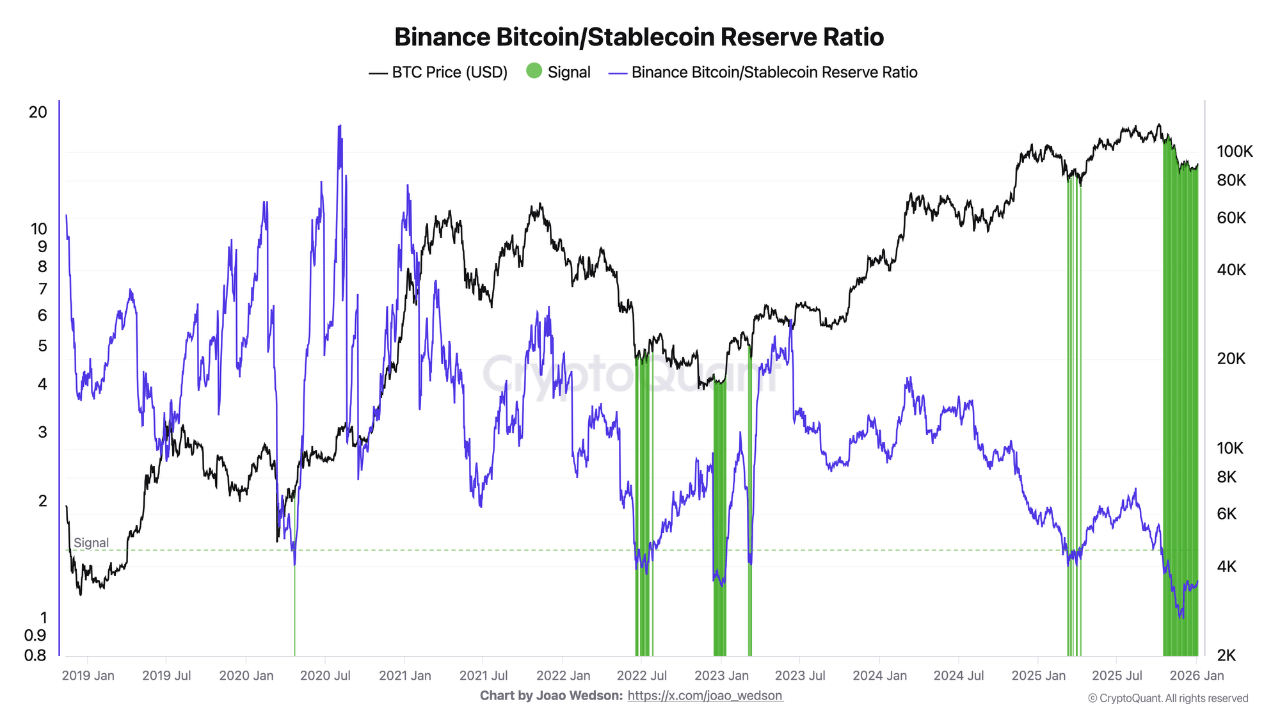 L'analyse de Darkfost souligne une nuance importante derrière le récent rebond du Bitcoin. Bien que le BTC ait augmenté d'environ 8 000 $ au cours de la semaine dernière – soutenu par une expansion de près de 4 milliards de dollars de l'open interest – le ratio Bitcoin/stablecoin sur Binance continue d'envoyer un signal notablement constructif. Dans les cycles précédents, les fortes reprises des prix étaient souvent accompagnées d'une baisse immédiate des réserves de stablecoins. Ce n'est pas ce qui se passe actuellement.