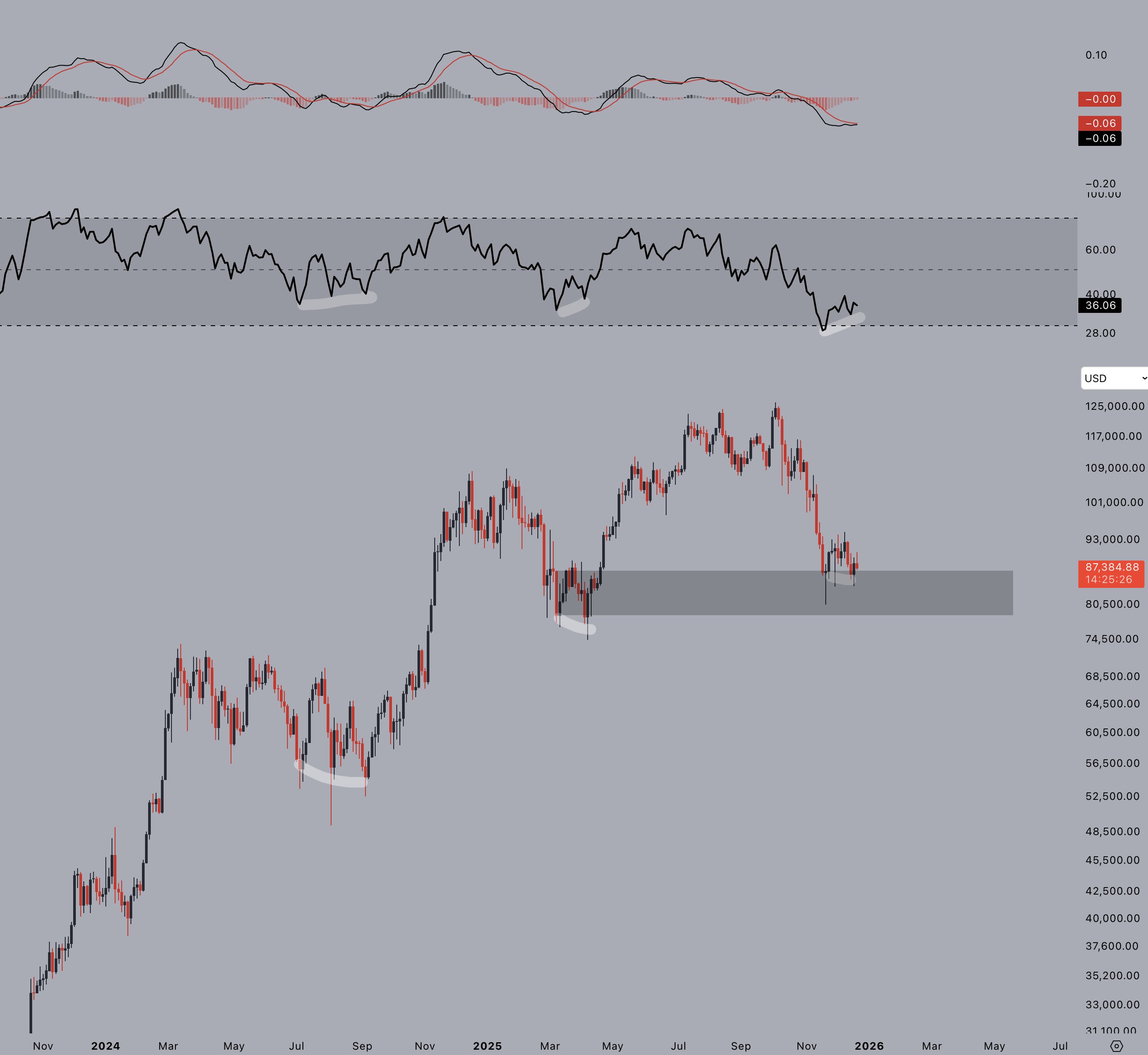 J'attends aujourd'hui cette descente vers 86 800 $ pour une éventuelle entrée longue si ce niveau tient.