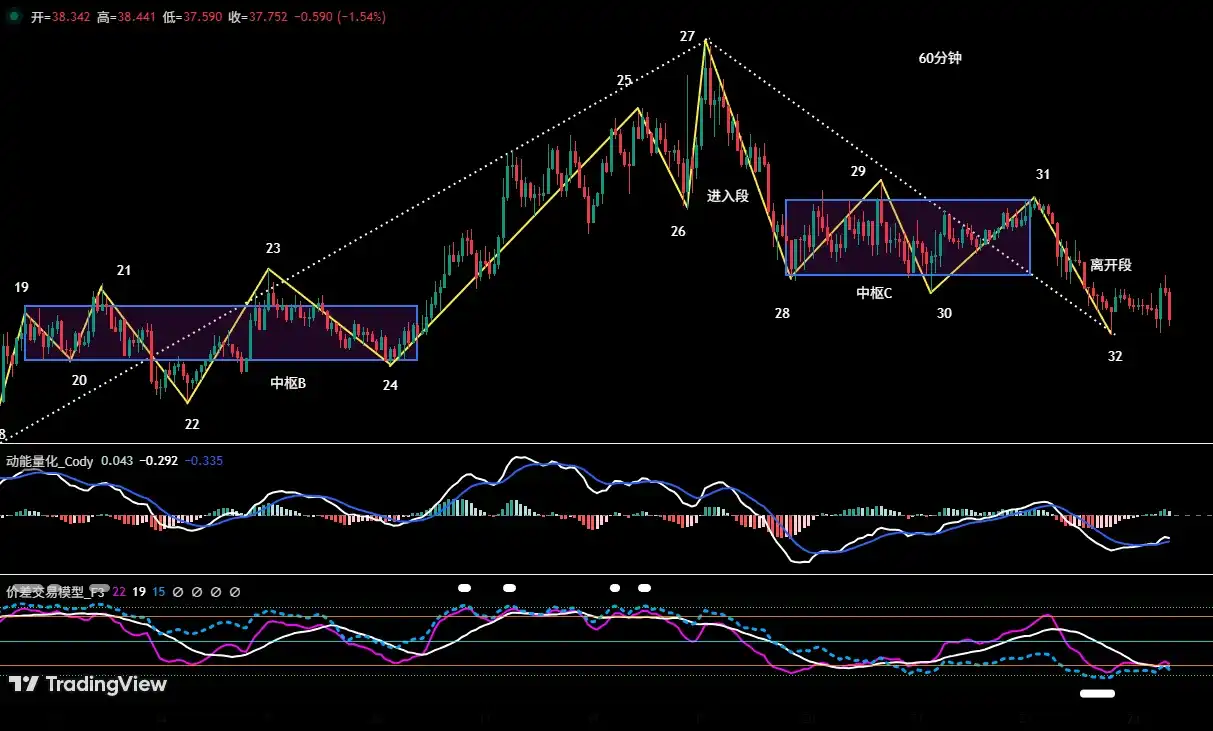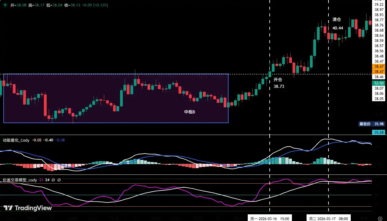 • Décision d'ouverture : Cette décision d'ouverture était basée sur la prévision de la poursuite de la tendance après l'achèvement de la construction du centre haussier B. Le signal déclencheur spécifique était la rupture effective par le prix de la résistance de la rail supérieure du centre (environ 38,54 dollars), et les deux modèles quantitatifs d'écart et de dynamique émettant des signaux haussiers de résonance, la superposition de multiples justifications augmentant significativement la fiabilité du timing d'entrée. Sur cette base, nous avons exécuté une ouverture de position longue de 30 % du capital à 38,73 dollars.