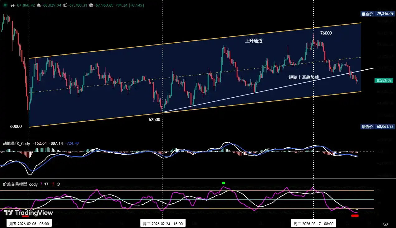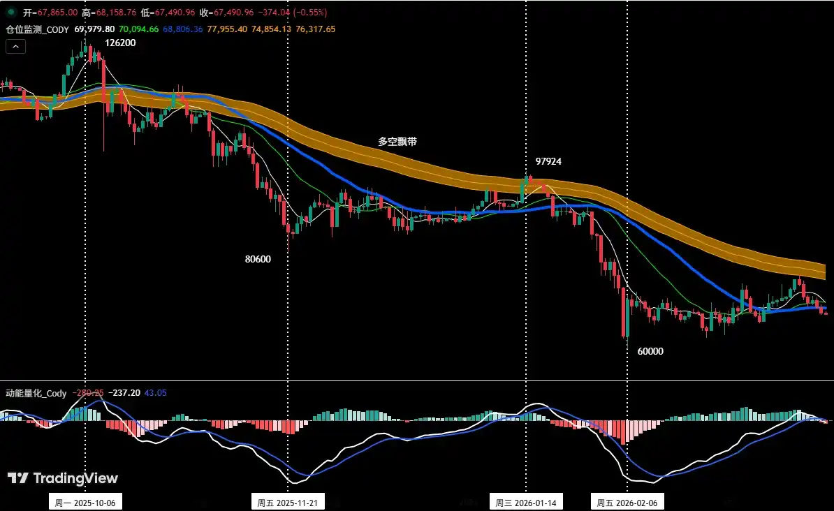 La stratégie à moyen terme continue de progresser稳健ement. Nous continuons à détenir la position courte de 60 % établie vers 89 000 dollars (28 janvier). À la clôture de la semaine dernière (prix de clôture environ 67 865 dollars), le profit était d'environ 23,75 %, le profit maximum期间 atteignant 32,58 %, la position à moyen terme fonctionnant globalement bien.