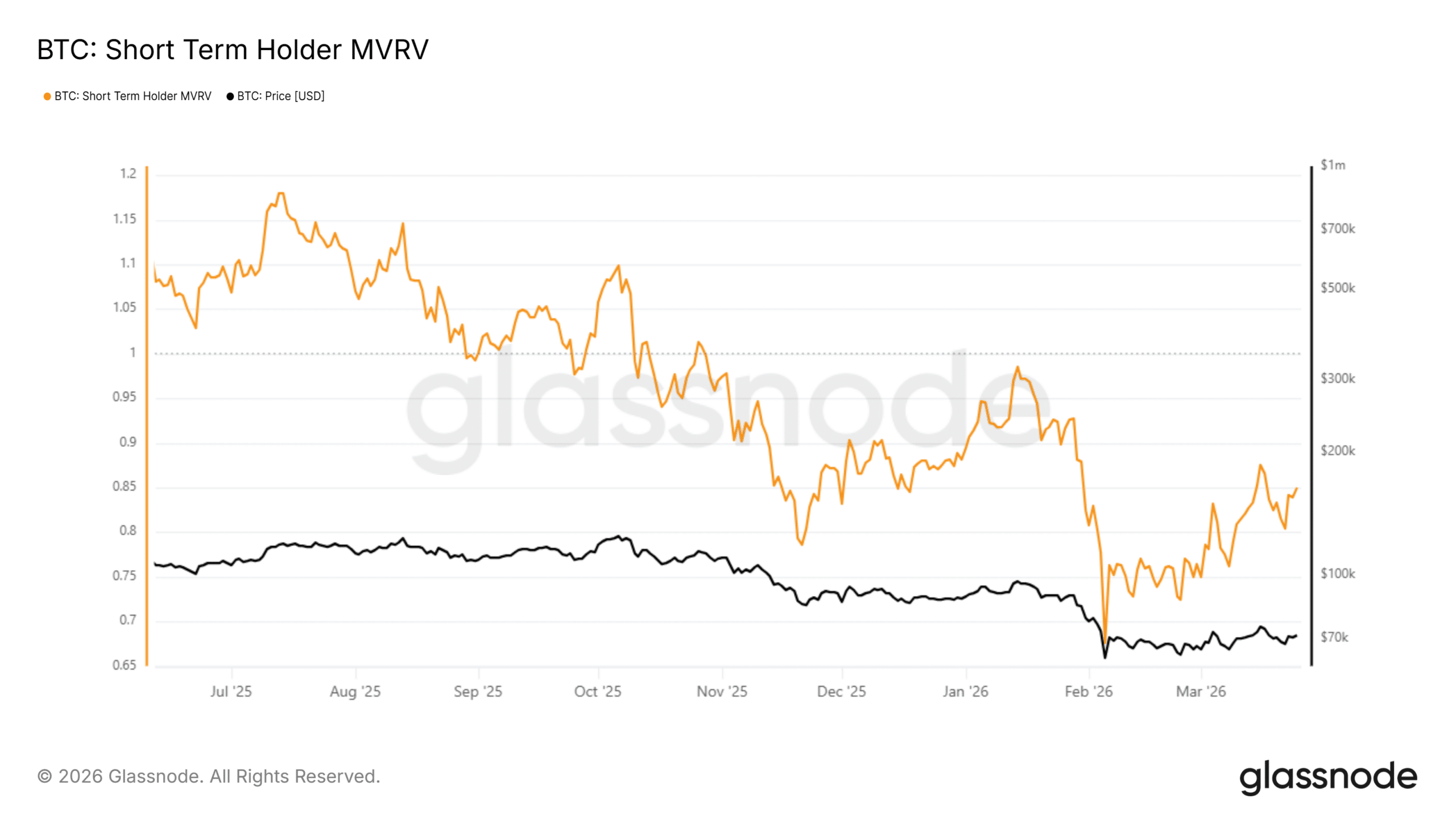 Le positionnement des détenteurs à court terme définit désormais les contraintes à la hausse du Bitcoin dans la fourchette actuelle. Alors que le prix se maintient près des zones de support, le STH-MVRV à 0,84 montre que les acheteurs récents restent environ 16 % dans le rouge.