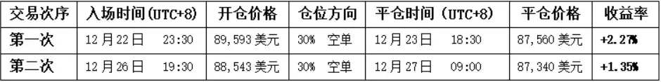 • Première transaction (bénéfice de 2,27%) : Basée sur le modèle "vente à découvert lors d'une résistance dans la zone de pression centrale après un rebond". Lorsque le cours a rencontré une résistance dans la zone de 89 500 ~ 91 000 dollars, le modèle de trading sur écart a simultanément émis un signal de sommet, permettant d'établir une position vendeuse de 30%, finalement clôturée avec profit lorsque le prix est retombé près de la zone de support.