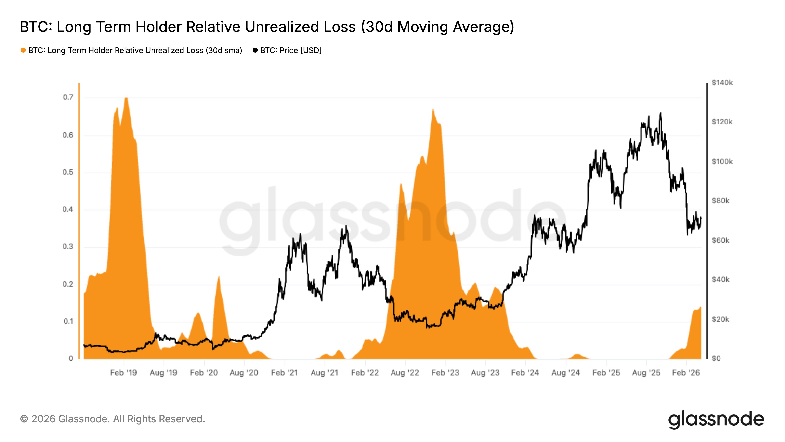 Comme l’a souligné la firme d’analyse on-chain Glassnode dans un post sur X, la Perte Non Réalisée parmi les détenteurs à long terme de Bitcoin a été élevée récemment. Les « détenteurs à long terme » (LTH) désignent ici les investisseurs en BTC qui détiennent leurs jetons depuis plus de 155 jours. Ce groupe est considéré comme incluant les « HODLers » résolus du marché.