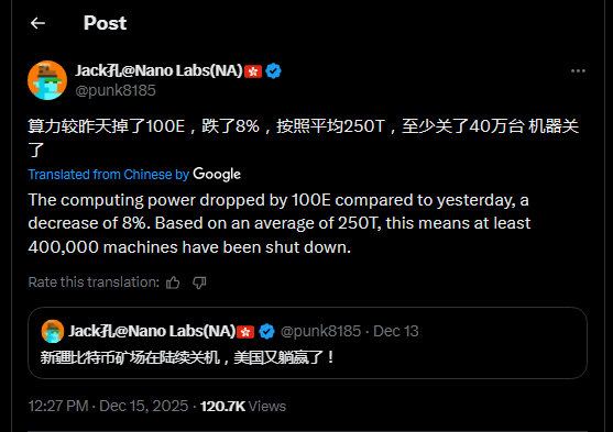 Il a écrit qu'« au moins 400 000 machines » avaient été mises hors ligne, en utilisant un taux supposé de 250 TH/s par ASIC comme base.