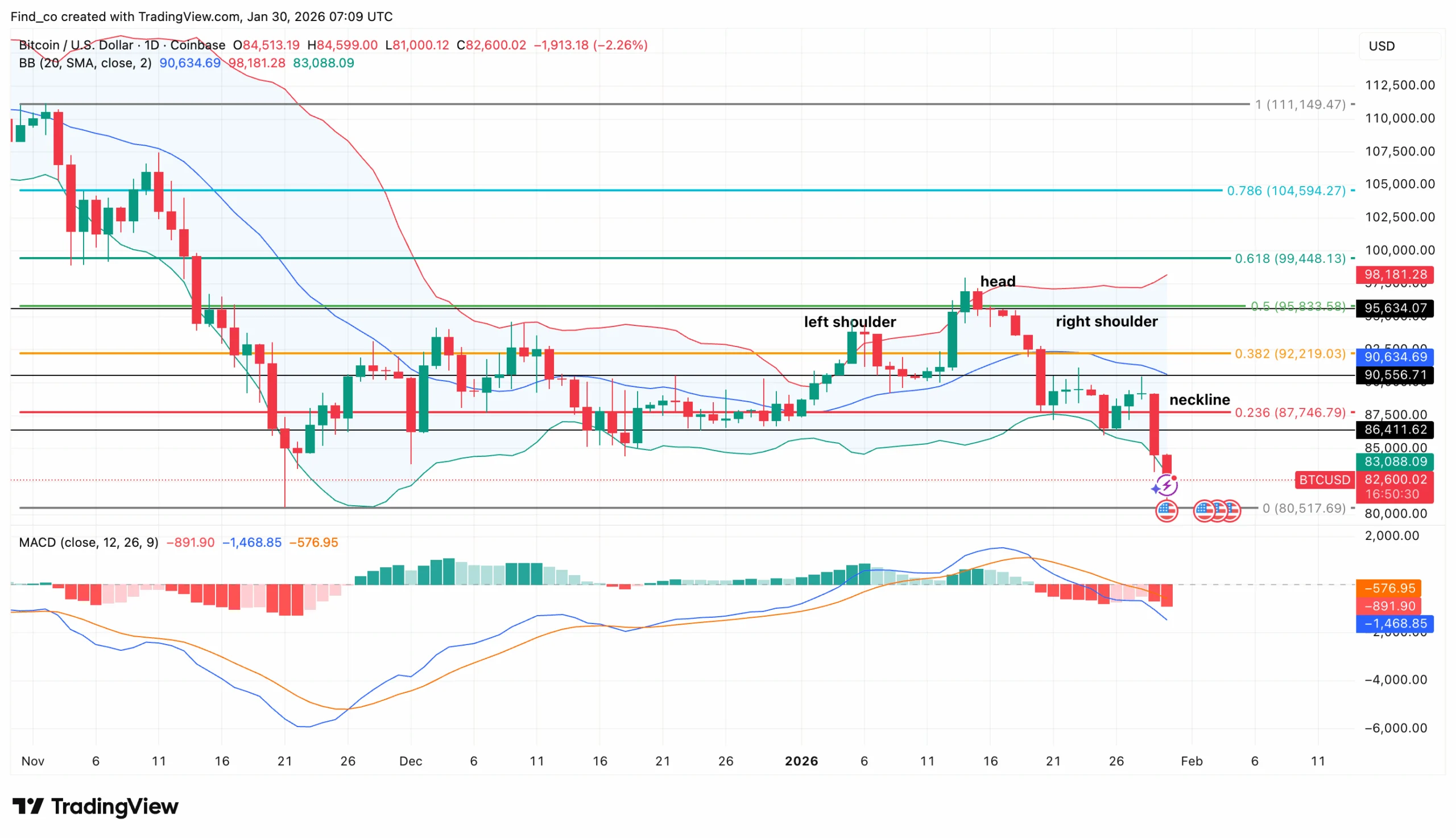 Jeudi, le célèbre influenceur crypto Crypto Bitlord a averti que le Bitcoin pourrait chuter beaucoup plus, identifiant 30 000 $ comme le prochain niveau de support majeur. « Le prochain support majeur pour le bitcoin est 30 k$ », a écrit le compte X. « Malheureusement. » Benjamin Cowen, fondateur de la plateforme d'analyse crypto Into The Cryptoverse, a fait écho à cette perspective baissière, affirmant que la faiblesse du Bitcoin correspond aux tendances historiques et au resserrement macroéconomique. « Aujourd'hui, nous allons parler du Bitcoin et discuter des raisons pour lesquelles le prix baisse et pourquoi je pense qu'il continuera probablement à baisser », a déclaré Cowen dans une récente vidéo YouTube. Cowen a déclaré qu'il pensait que le Bitcoin était déjà entré dans un marché baissier après avoir atteint un pic en octobre 2025. « Je pense en effet que le Bitcoin est dans un marché baissier », a-t-il déclaré. « Je suppose que le crypto continue de baisser », a ajouté Cowen, précisant que « le Bitcoin va probablement continuer à saigner face au marché boursier. » La chute du Bitcoin intervient dans un contexte de débâcle plus large des marchés mondiaux qui a vu environ 3 000 milliards de dollars de valeur marchande effacés en moins d'une heure jeudi. Les métaux précieux, malgré des rallyes historiques récents, n'ont pas été épargnés. L'or a perdu environ 1 500 milliards de dollars de valeur marchande, les prix chutant de près de 10 % par rapport aux récents sommets, tandis que l'argent a chuté d'environ 12 %. Le critique de longue date du Bitcoin, Peter Schiff, a saisi l'occasion pour commenter la chute du BTC, affirmant que l'actif a significativement sous-performé l'or sur le long terme malgré le soutien institutionnel croissant. « Le Bitcoin ne vaut plus que 15,5 onces d'or, en baisse de 57 % par rapport à son sommet de 2021 et seulement 10 % au-dessus de son sommet de 2017 », a écrit Schiff. « Malgré tout le battage médiatique et le soutien de Wall Street et de l'administration Trump, la plupart des personnes qui possèdent maintenant du Bitcoin auraient été mieux avisées d'acheter de l'or ou de l'argent à la place », a-t-il ajouté. D'un point de vue technique, les analystes affirment que la structure du graphique du Bitcoin s'est encore détériorée. Victor Olanrewaju, analyste chez CCN, a déclaré que le Bitcoin avait confirmé un modèle de renversement baissier sur le graphique quotidien après avoir franchi les niveaux de support clés. « D'un point de vue technique, le prix du Bitcoin a prolongé sa vente, tombant en dessous de la ligne de cou à 86 400 $ et confirmant une rupture de configuration tête-épaules sur le graphique quotidien », a déclaré Olanrewaju. « Les indicateurs de momentum confirment le mouvement à la baisse », a-t-il déclaré, pointant le fait que l'indicateur de convergence/divergence des moyennes mobiles (MACD) est passé en territoire négatif. Olanrewaju a déclaré que si la pression vendeuse persistait, le Bitcoin pourrait dériver vers 80 517 $ « si le krach du marché crypto ne parvient pas à se retourner ». Il a averti qu'un déclin plus profond pourrait voir les prix tester les 78 000 $, où se situent une demande antérieure et un support structurel. Cependant, une reprise rapide au-dessus de la ligne de cou pourrait invalider la configuration baissière et conduire à un rebond vers 92 219 $.