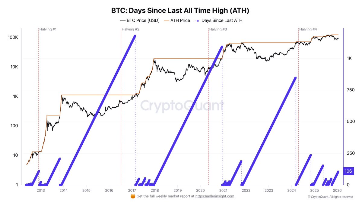 Le top analyste Darkfost a souligné que le marché est désormais à 109 jours du dernier plus haut historique du Bitcoin, ce qui place le recul actuel dans un contexte de cycle plus large. Lors des précédentes corrections majeures, le Bitcoin a mis beaucoup plus de temps à se rétablir, avec notamment 236 jours entre mars 2024 et novembre, suivi d'une autre fenêtre de correction de 154 jours entre décembre 2024 et mai 2025. Comparé à ces périodes, le recul actuel pourrait encore être à ses débuts, même si l'action des prix semble déjà agressive.
