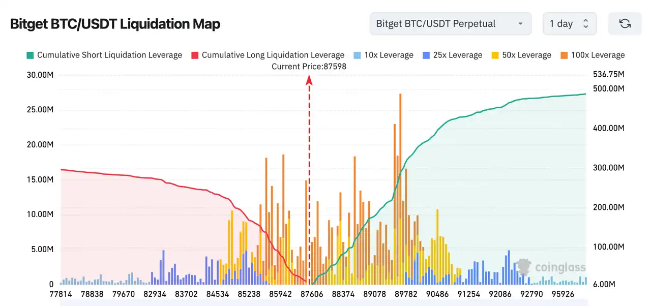 3. La carte des liquidations Bitget BTC/USDT montre : Près du prix actuel (≈87 600), une faille de liquidation long/short est évidente. Les liquidations short s'accumulent rapidement vers le haut, créant des conditions propices à un squeeze haussier (short squeeze) en cas de hausse. Les liquidations long en dessous sont plus dispersées et plus faibles, indiquant que les baisses ressemblent plus à des retraits lents, tandis que les hausses, une fois amorcées, pourraient s'accélérer plus facilement.