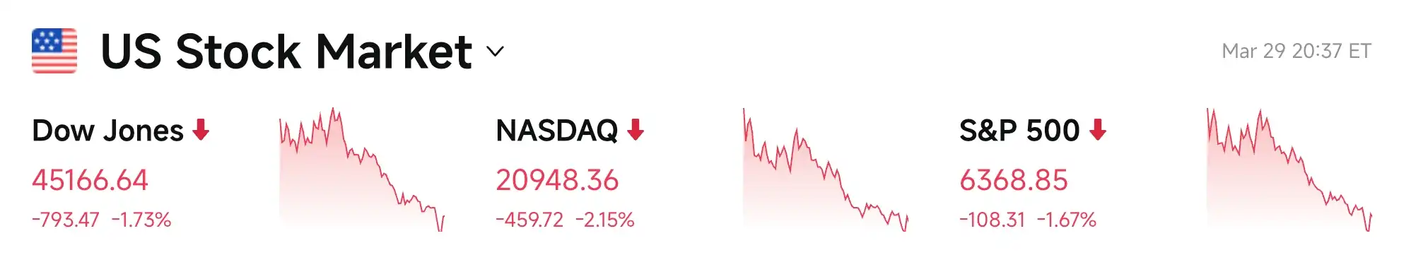 - S&P 500 : -1,67 % à 6368,85 points, en retrait de 8,7 % depuis le pic de janvier.