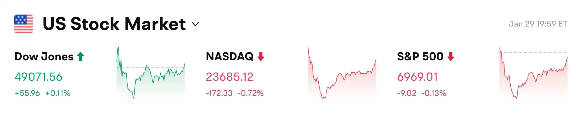 Les actions US ont légèrement reculé sous l'effet des résultats de Microsoft, mais des données économiques robustes soutiennent un rebond, prévoyant une outperformance des actions américaines en 2026 par rapport aux marchés étrangers ; les métaux précieux, l'or très volatile, l'argent rebondit vigoureusement après sa chute, porté par la demande industrielle ; risques persistants de surplus pétrolier à court terme ; le dollar légèrement en baisse aide au rebond des matières premières ; le marché crypto sous pression, BTC ETH -5%, liquidations à effet de levier atteignant 3,19 milliards de $, les analystes avertissent d'un sentiment de refuge dominant à court terme, mais une clarification réglementaire comme Project Crypto pourrait booster la confiance à long terme. Goldman Sachs suggère d'acheter l'or en correction, Morgan Stanley est optimiste sur la reprise des actions US.