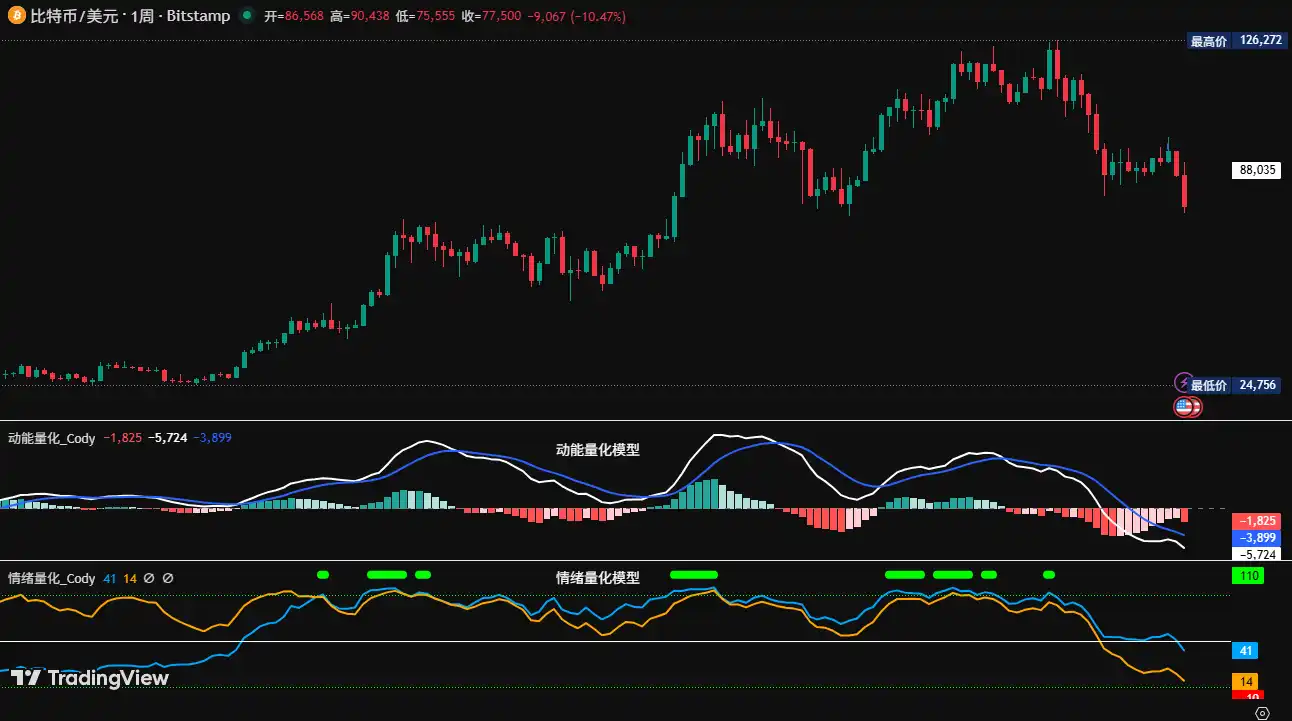 • Le Bitcoin est entré dans une phase d'ajustement après avoir atteint un sommet de 126 200 dollars le 6 octobre 2025, pour chuter à 80 600 dollars le 21 novembre, sur une période de 46 jours, avec une baisse maximale d'environ 36 %. Grâce à notre système de trading créé indépendamment, nous avons appris qu'à la clôture du 24 novembre, le prix hebdomadaire du Bitcoin était tombé en dessous de la ligne de tendance haussière/baissière du modèle de surveillance (ligne jaune sur la Figure 1), tandis que la ligne d'énergie dynamique blanche du modèle de quantification de l'énergie dynamique avait franchi l'axe zéro, les deux signaux formant une résonance, nous avons donc jugé que le Bitcoin était entré dans une tendance baissière à moyen terme. Ainsi, l'auteur a indiqué dans les commentaires hebdomadaires du 28 décembre 2025 et du 4 janvier 2026 que la hausse initiée à partir du point bas de 80 600 dollars était de nature rebond après une survente.
