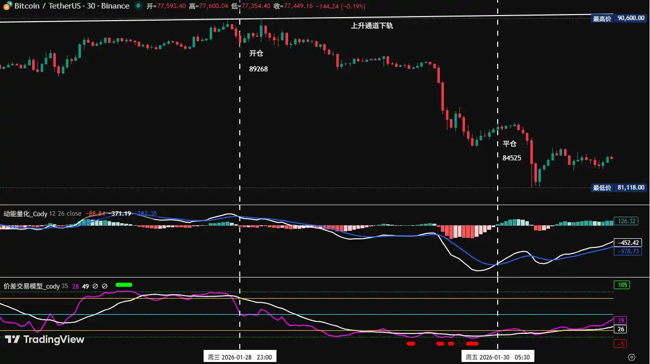 • Première transaction (profit de 5,1 %) : Cette opération a exécuté la stratégie Option A (vendre à découvert après une rupture effective de la borne inférieure du canal haussier) : Lorsque le prix de la crypto-monnaie a rebondi vers la borne inférieure du canal haussier montrant une faiblesse à la hausse, le modèle d'écart a d'abord émis un signal d'alerte de sommet (point vert), puis lui et le modèle d'énergie dynamique ont résonné pour déclencher un signal de sommet, nous avons établi une position vendeuse de 30 % à 89 268 dollars, puis le marché a subi un ajustement. Lorsque le prix est tombé au niveau de support de 84 000 dollars, le modèle d'écart a率先 émis un signal d'alerte de fond (point rouge), puis le modèle de quantification de l'énergie dynamique et le modèle de trading sur écart ont à nouveau résonné pour générer un signal de fond, sur cette base, nous avons clôturé toutes les positions à 84 525 dollars, réalisant un profit réussi.