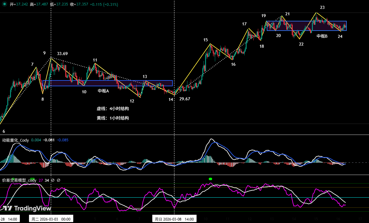 • Décision de clôture : Sur la base des signaux de résonance de haut de cycle émis par le modèle d'arbitrage et le modèle quantitatif d'énergie dynamique, et le prix approchant le sommet de la vague I à 38,41 $, nous avons liquidé à environ 37,19 $.