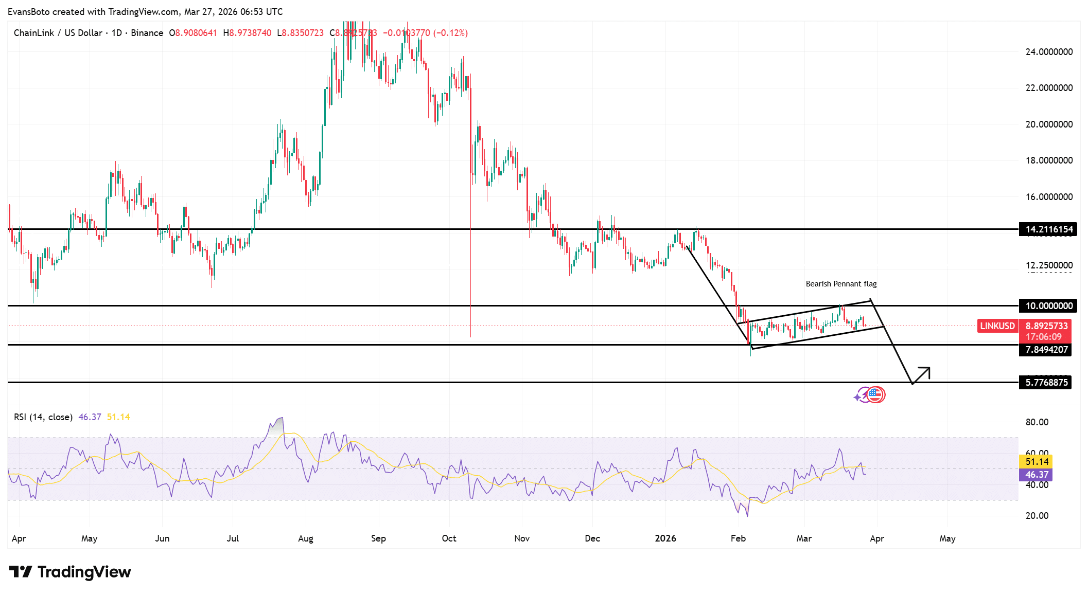 Le LINK continue de se négocier en dessous de la résistance des 10 $ tout en formant une structure de pavillon baissier. Le prix a récemment chuté vers 7,84 $ avant de se stabiliser près de 8,89 $, ce qui reflète une compression continue après une chute brutale.