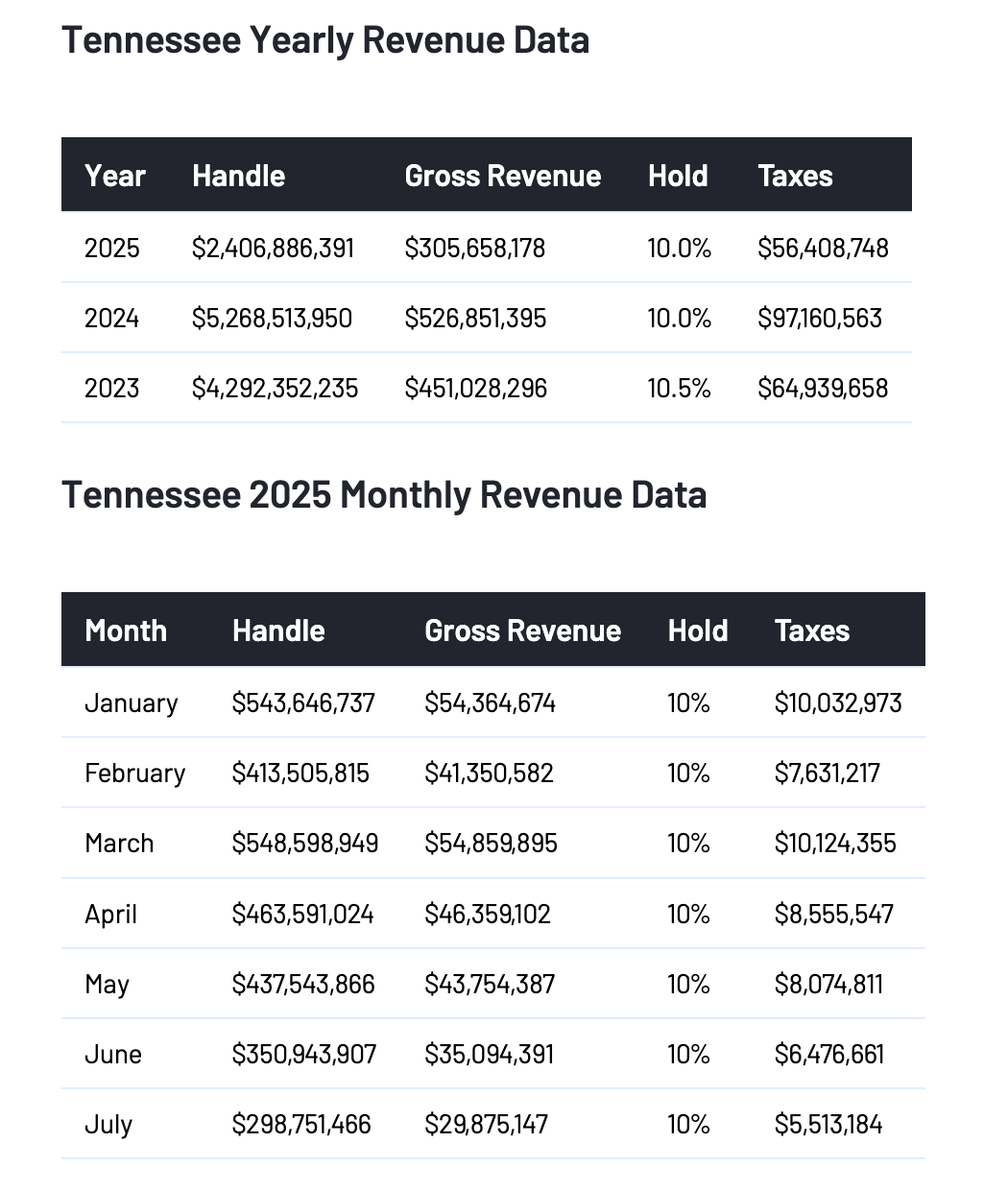 Le marché des paris sportifs a contribué de manière significative aux recettes fiscales du Tennessee. Les statistiques de Sports Book Review (graphique ci-dessous, données jusqu'en juillet 2025) montrent que en 2024, le montant total des paris sportifs dans le Tennessee avait déjà atteint 5,268 milliards de dollars, et la contribution fiscale avait atteint 97,16 millions de dollars; pour les 7 premiers mois de 2025, le montant total des paris avait atteint 2,4 milliards de dollars, et la contribution fiscale avait déjà atteint 56,4 millions de dollars.