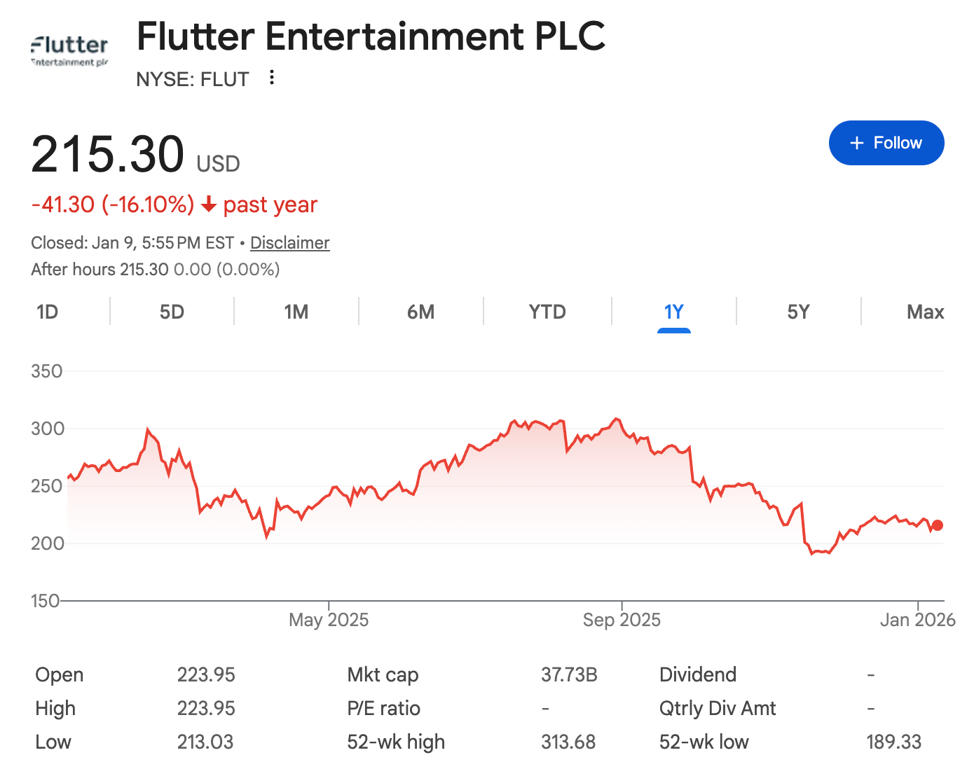 Le marché des capitaux avait déjà senti la menace croissante que représente Polymarket pour les services traditionnels de paris sportifs. Les deux géants du marché des paris sportifs, DraftKings et Flutter Entertainment, ont enregistré des baisses de 11,7 % et 16,1 % respectivement sur un an — pendant la même période, le marché boursier américain connaissait un grand bull market, le Dow Jones ayant progressé de 12,97 % sur l'année, le Nasdaq de 20,36 % l'année dernière et le S&P 500 de 16,39 %; et la taille du marché des paris sportifs a continué sa tendance haussière de huit ans.