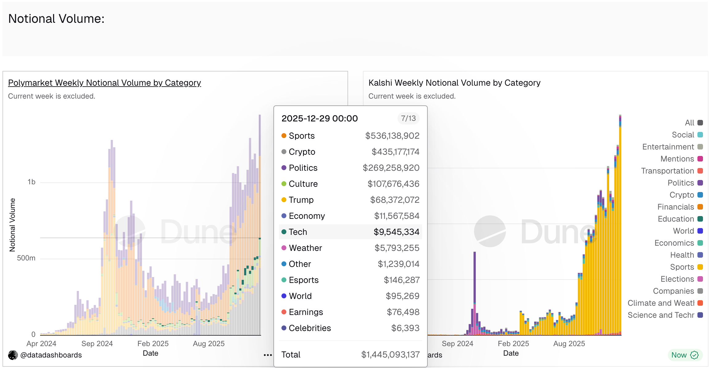 Si le marché des prédictions n'était qu'un petit terrain d'expérimentation, cela pourrait passer, mais la réalité est que la croissance du marché des prédictions est encore plus aberrante que celle du marché des paris sportifs déjà très important — en 2025, le volume total des transactions sur le marché des prédictions était d'environ 40 milliards de dollars, soit une croissance d'environ 400 % par rapport aux 9 milliards de dollars de 2024. Data Dashboards montre dans son tableau de bord de données compilé sur Dune (graphique ci-dessous) que les contrats d'événement de type sportif sont depuis longtemps devenus la catégorie avec la plus grande part de volume de transactions sur le marché des prédictions.