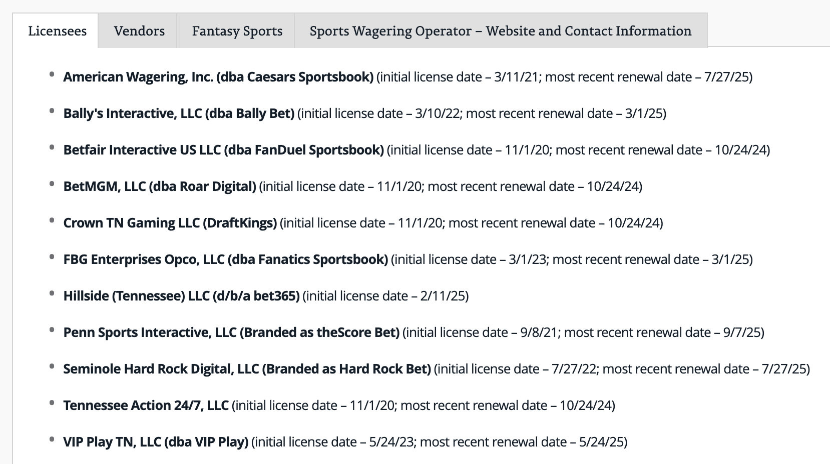 Actuellement, le SWC est le seul organisme de régulation des paris sportifs du Tennessee, responsable des licences d'exploitation, de la supervision de la conformité, de l'élaboration des règles et de l'application de la loi. Le SWC stipule que tous les fournisseurs de paris sportifs doivent obtenir une licence du SWC pour pouvoir proposer leurs services dans cet État. À ce jour, 11 licences au total ont été délivrées (graphique ci-dessus); seuls les résidents âgés de 21 ans et plus peuvent accéder aux services connexes, et doivent passer par une vérification géographique pour s'assurer qu'ils parient bien dans l'État; concernant la fiscalité, l'État prélève une taxe de 1,85 % sur le montant total des paris — un système de taxation basé sur les revenus était initialement en place, mais a été modifié après 2023 pour taxer sur la base du montant total des paris.