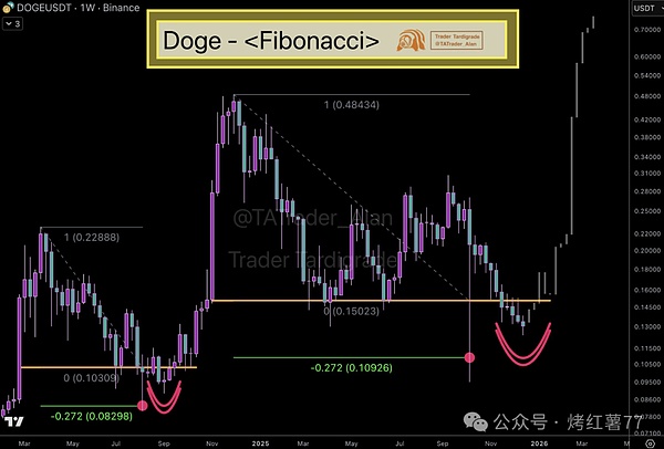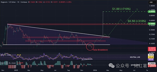 Les niveaux de résistance clés se situent autour de 0,18 dollar (niveau de support historique converti) et près de 0,22 dollar. Si une rupture effective est réalisée par la suite, l'objectif de la configuration technique pourrait se situer autour de 0,50 dollar, représentant un gain potentiel d'environ 310 % par rapport aux niveaux actuels. Si la force se maintient à moyen et long terme, elle pourrait même défier le seuil de 1 dollar, ce qui correspondrait à une hausse d'environ 710 %.