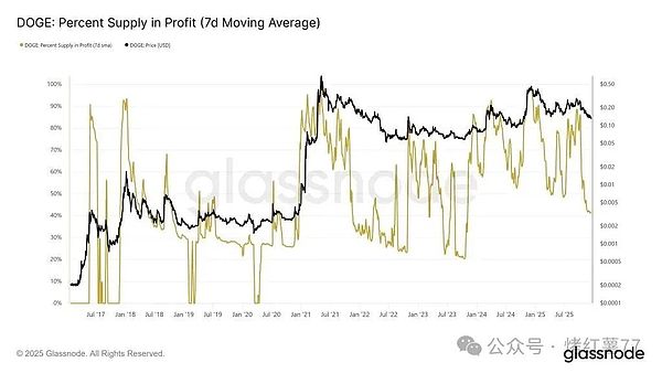 Les données on-chain apportent également un soutien. Les statistiques de Glassnode montrent que la part de l'offre circulante de DOGE actuellement en situation de profit a diminué, et la moyenne mobile sur sept jours indique que le nombre d'adresses rentables est inférieur aux sommets cycliques précédents.