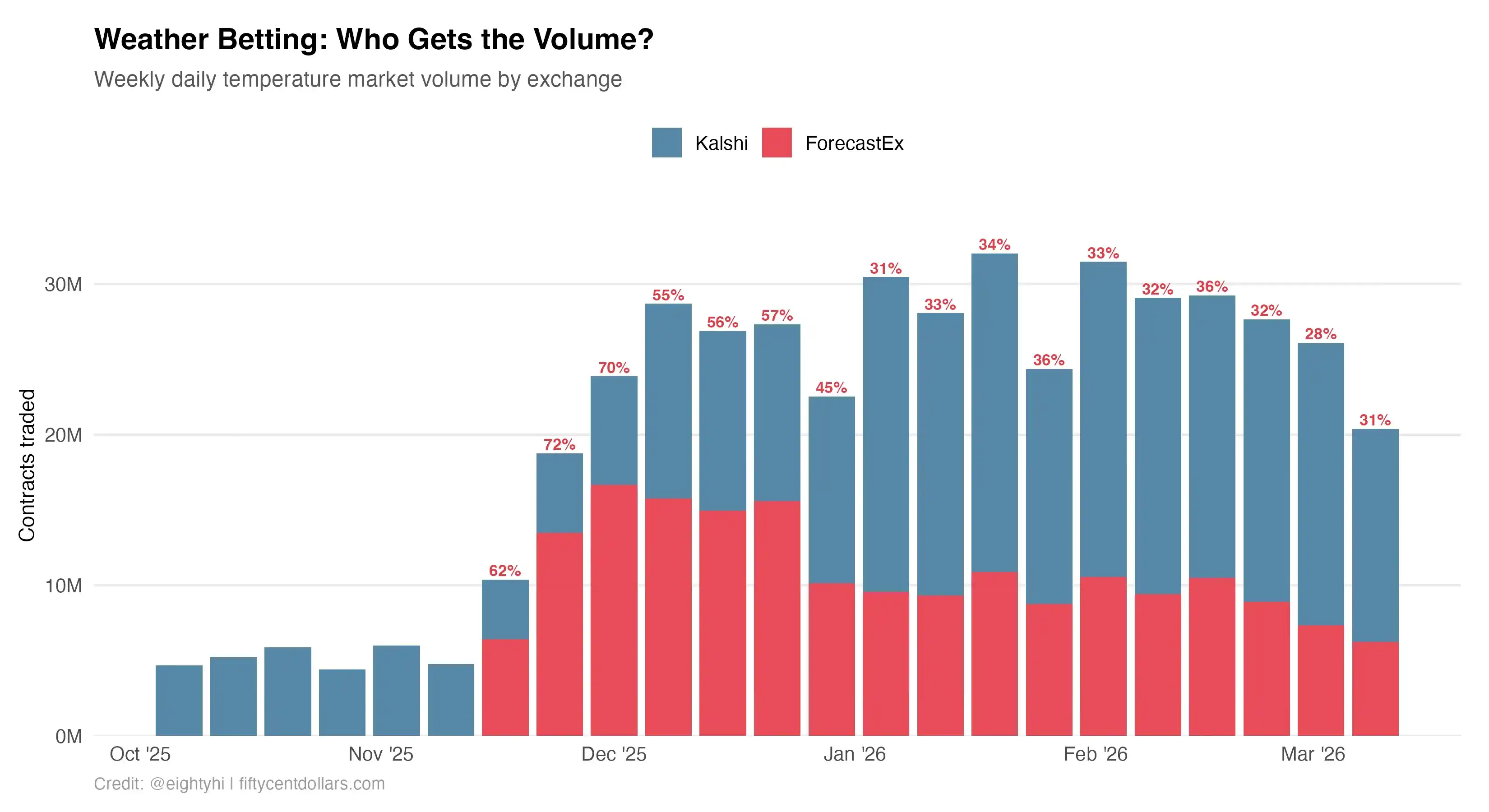 Les cinq premières semaines n'avaient que Kalshi, c'est la ligne de base. Ensuite ForecastEx est apparu et a immédiatement capturé 60 % du volume quotidien combiné du marché des températures. Il a atteint un pic de 72 % fin novembre et s'est globalement maintenu entre 53 % et 67 % depuis.