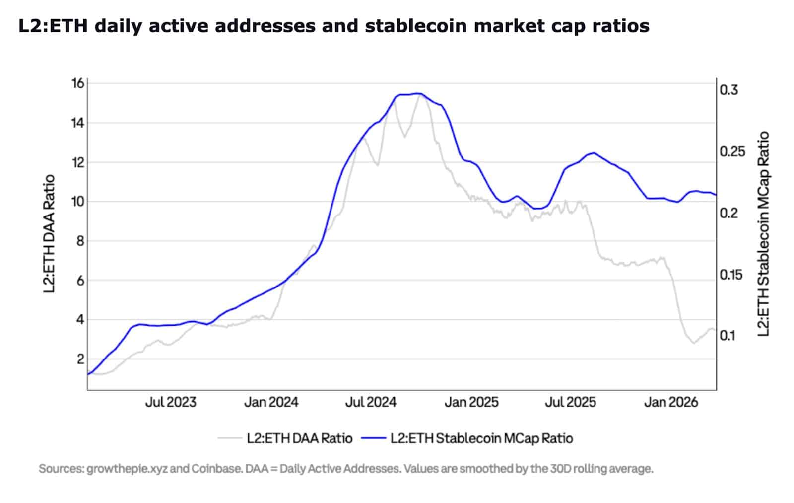 Cependant, cette croissance n'a pas duré, le ratio est tombé autour de 10–11 d'ici 2026, montrant que l'activité des utilisateurs a ralenti. Cette baisse suggère que l'utilisation des L2 s'affaiblit plutôt qu'elle ne se développe.