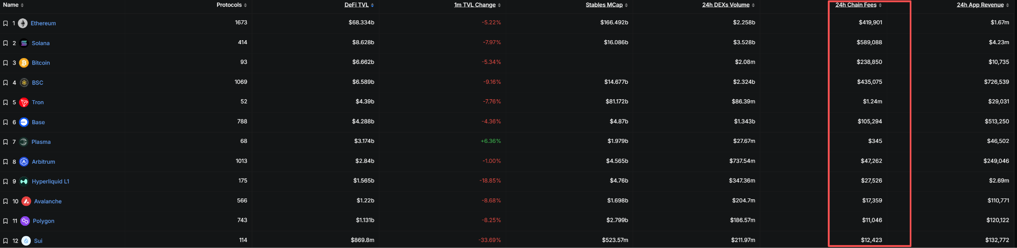 Au cours des 24 dernières heures, le classement des frais sur toutes les blockchains présente un paysage extrêmement polarisé :