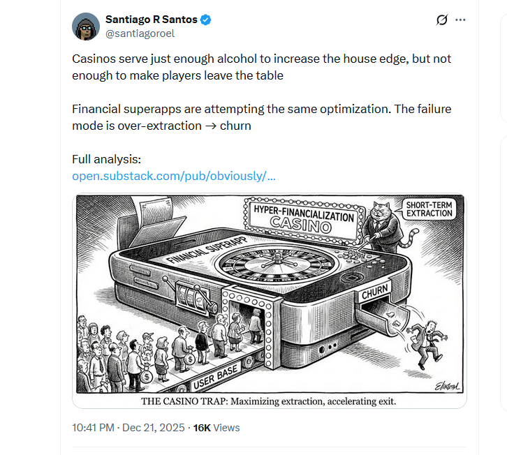 « Mais les utilisateurs vieillissent. Avec le temps, la vraie opportunité est de grandir avec eux et de capter plus de leur vie financière, et non de maximiser l'extraction au moment du pic de spéculation », a-t-il ajouté. « Si la durabilité compte, vous optimisez pour la longévité. »