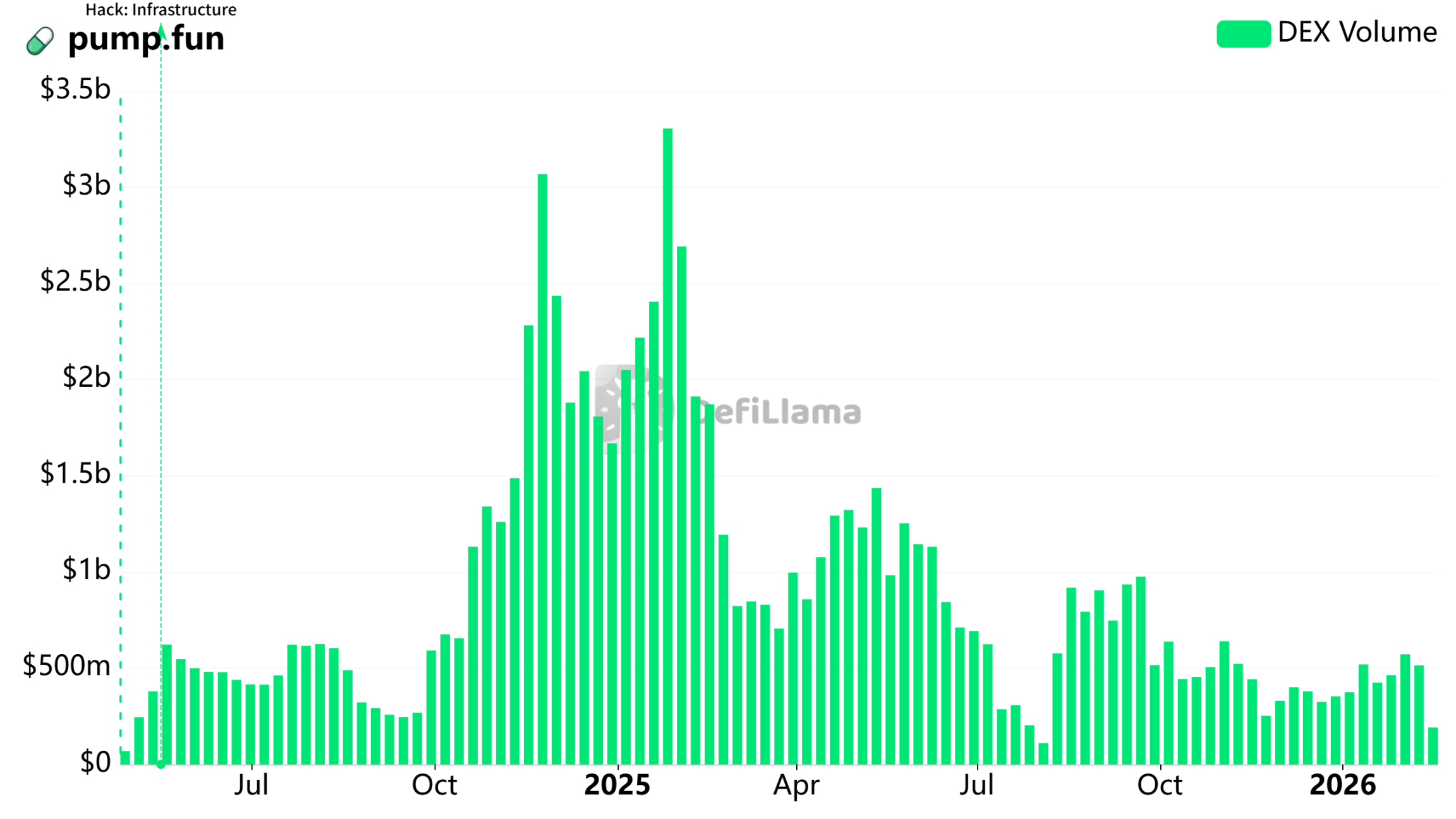 Les données de Defilama montrent que la plateforme Meme pump.fun a atteint des records de volume d'échanges autour de 2025. Le volume hebdomadaire a dépassé deux fois les 3 milliards de dollars, puis a chuté continuellement. Début 2026, son volume d'échanges stagnait autour de 500 millions de dollars, soit un sixième de son pic.