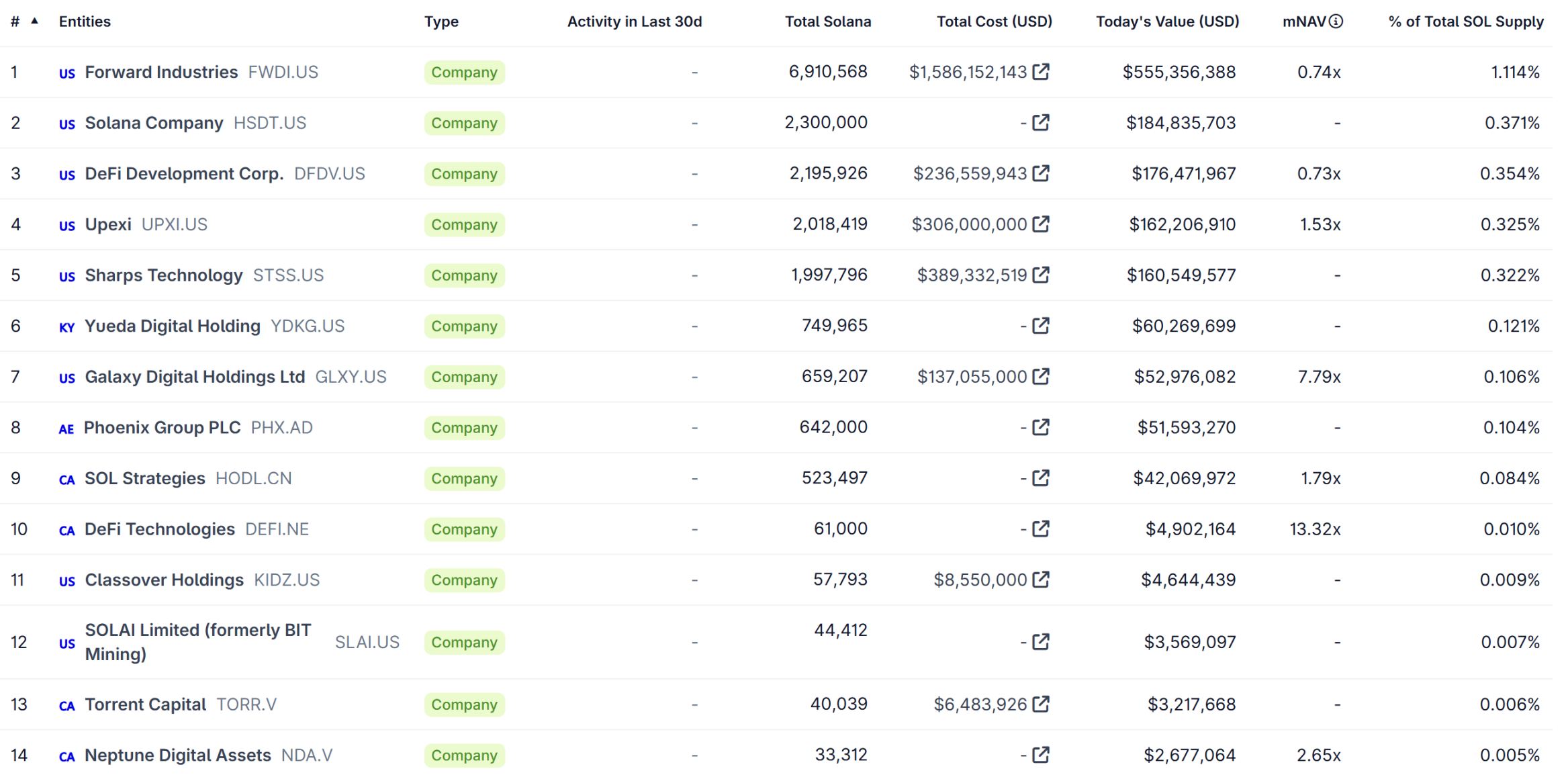 Du point de vue des trésoreries d'actifs numériques (DAT, Digital Asset Treasury), en 2025, le modèle DAT était très en vogue. De nombreuses sociétés cotées comme Forward Industries, Upexi et Sharps Technology ont acheté massivement du SOL comme actif de trésorerie via des financements privés ou des émissions de dette.