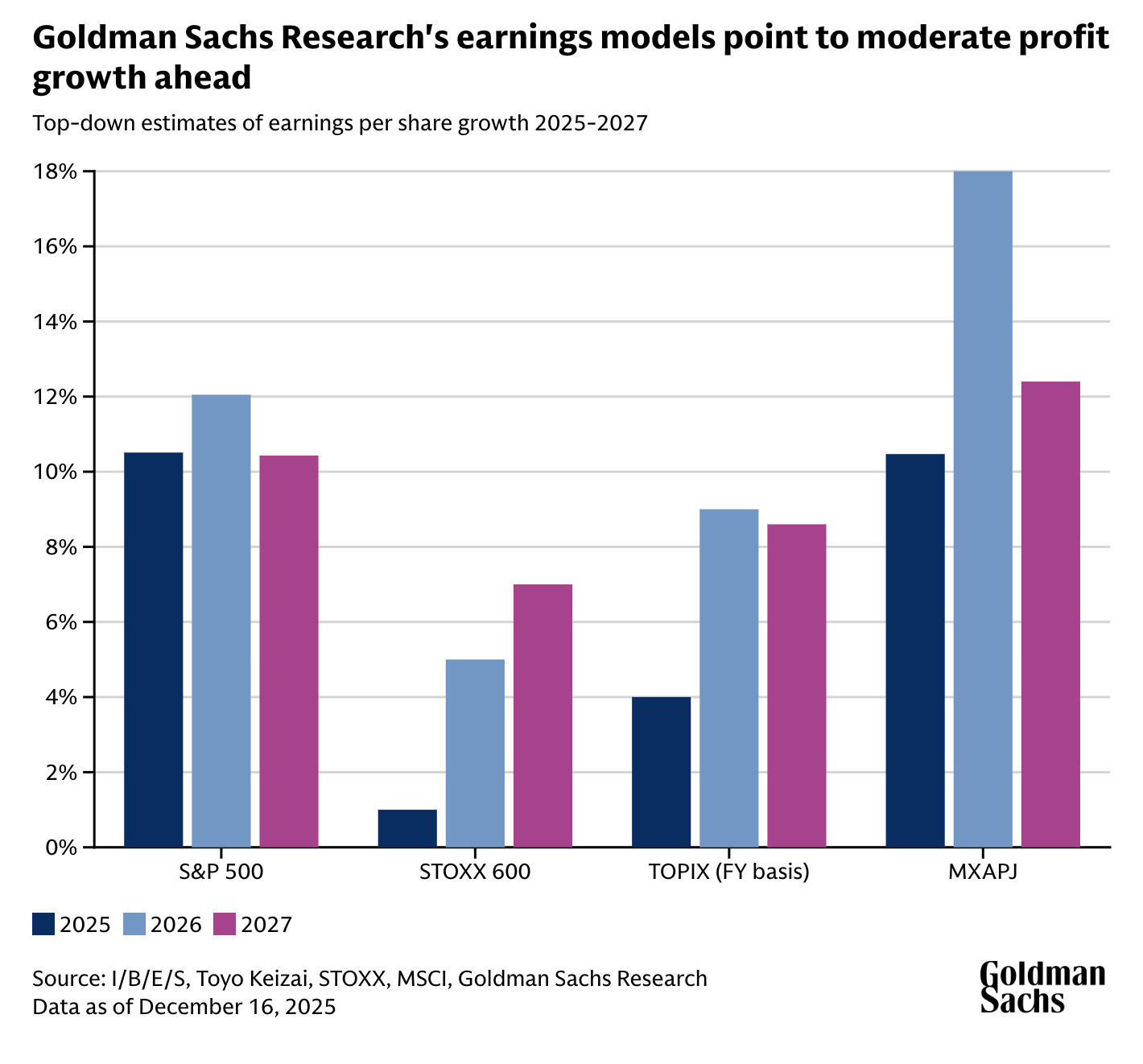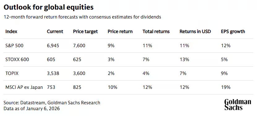 Après une forte croissance l'année dernière, le département de recherche de Goldman Sachs (Goldman Sachs Research) prédit que les marchés actions mondiaux devraient continuer à grimper en 2026, avec un rendement anticipé de 11% sur les 12 prochains mois (dividendes inclus, en dollars US).