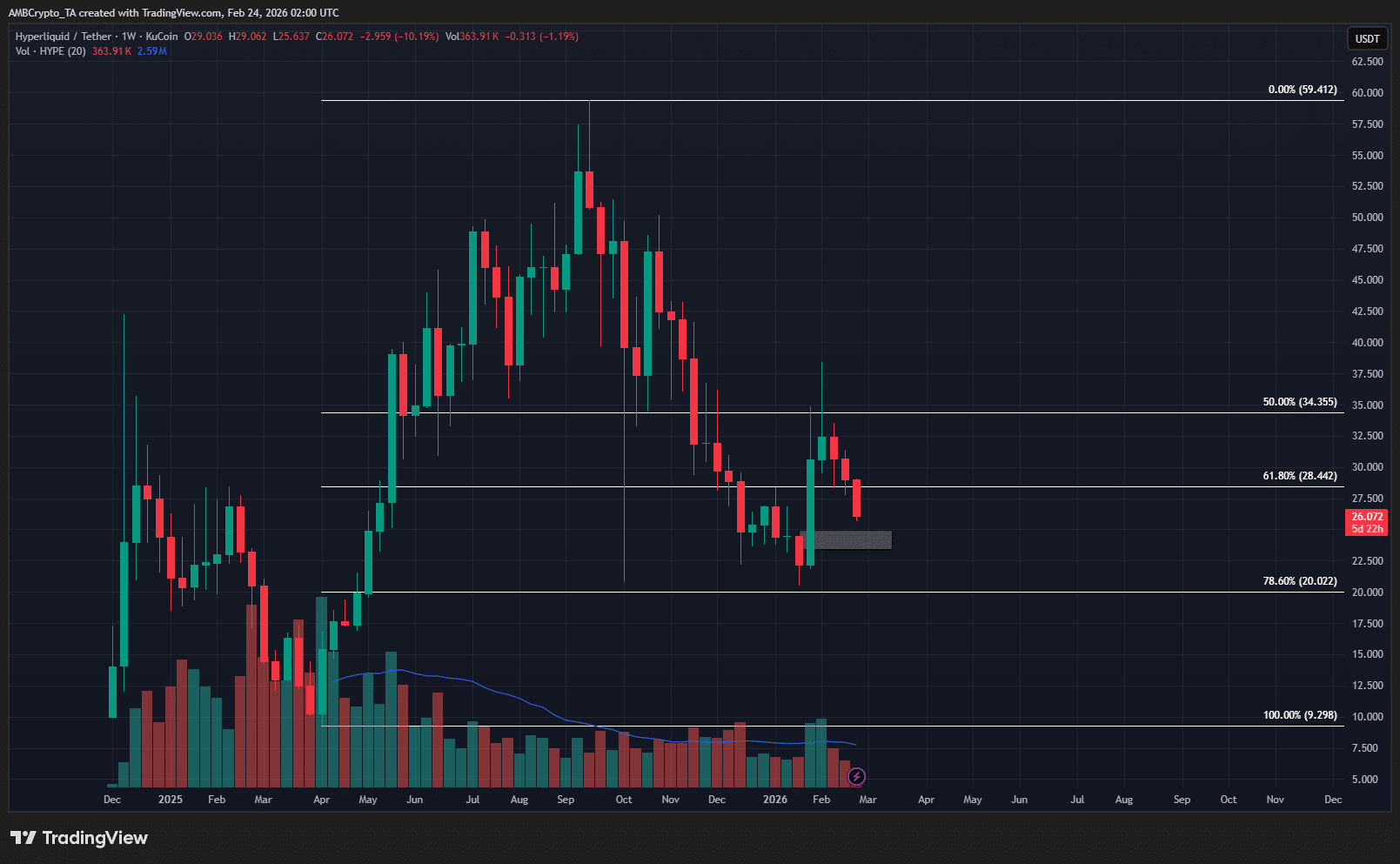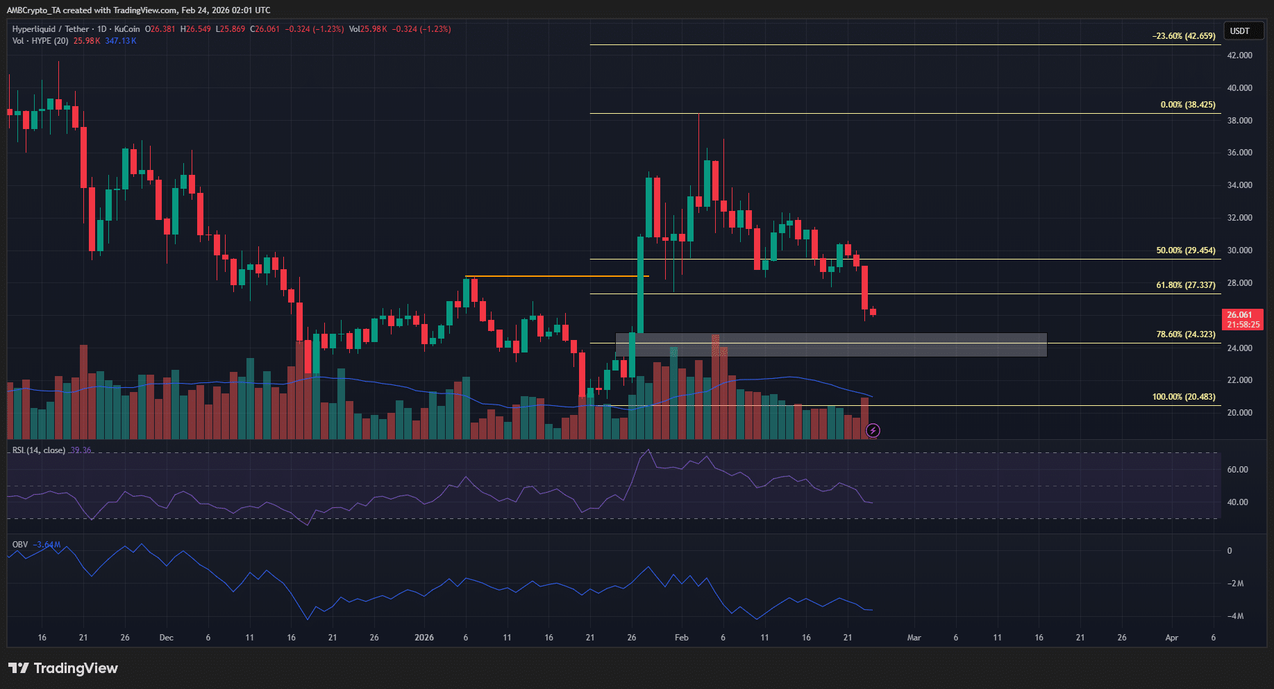 Pourtant, cela faisait partie d'un retracement sain. Les traders de swing et les investisseurs de HYPE peuvent attendre que le niveau de 24,3 $ soit défendu avant de chercher à prendre des positions longues. Ce niveau était le niveau de retracement de Fibonacci à 78,6 % pour le mouvement de swing haussier.